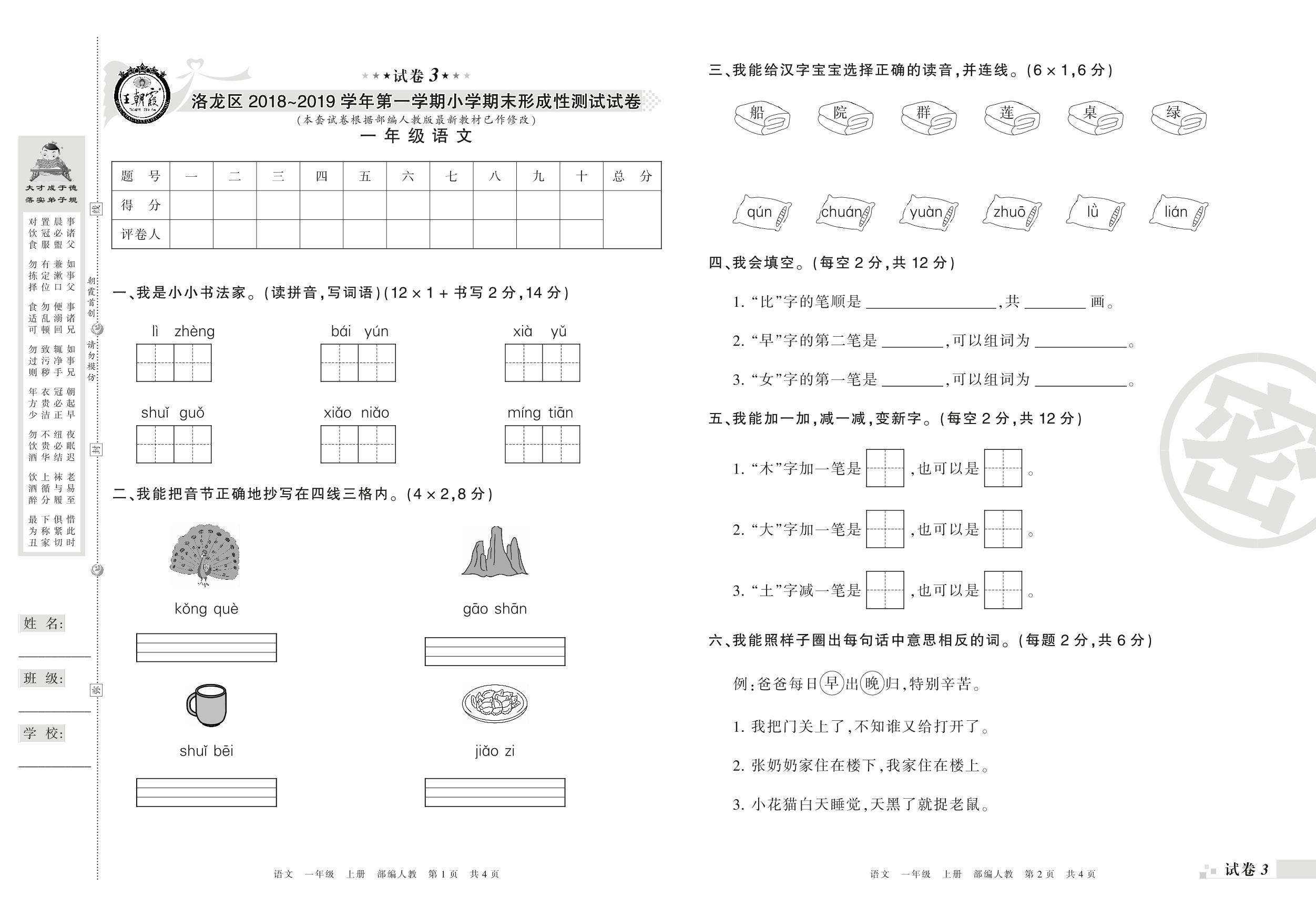 2018-2019学年第一学期洛阳市洛龙区一年级语文试卷(人教版)【3】