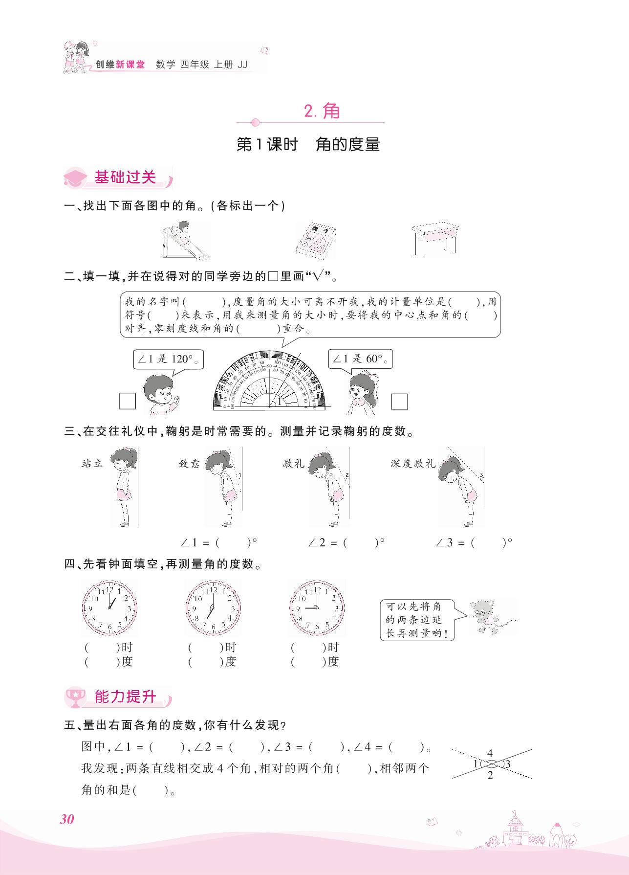 2021上册四年级数学冀教版 四 线和角 2. 角——第1课时 角的度量