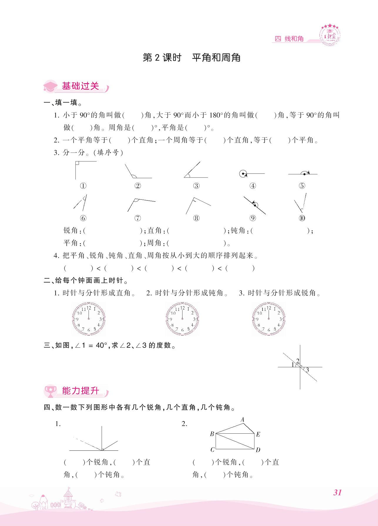 2021上册四年级数学冀教版 四 线和角 2. 角——第2课时 平角和周角