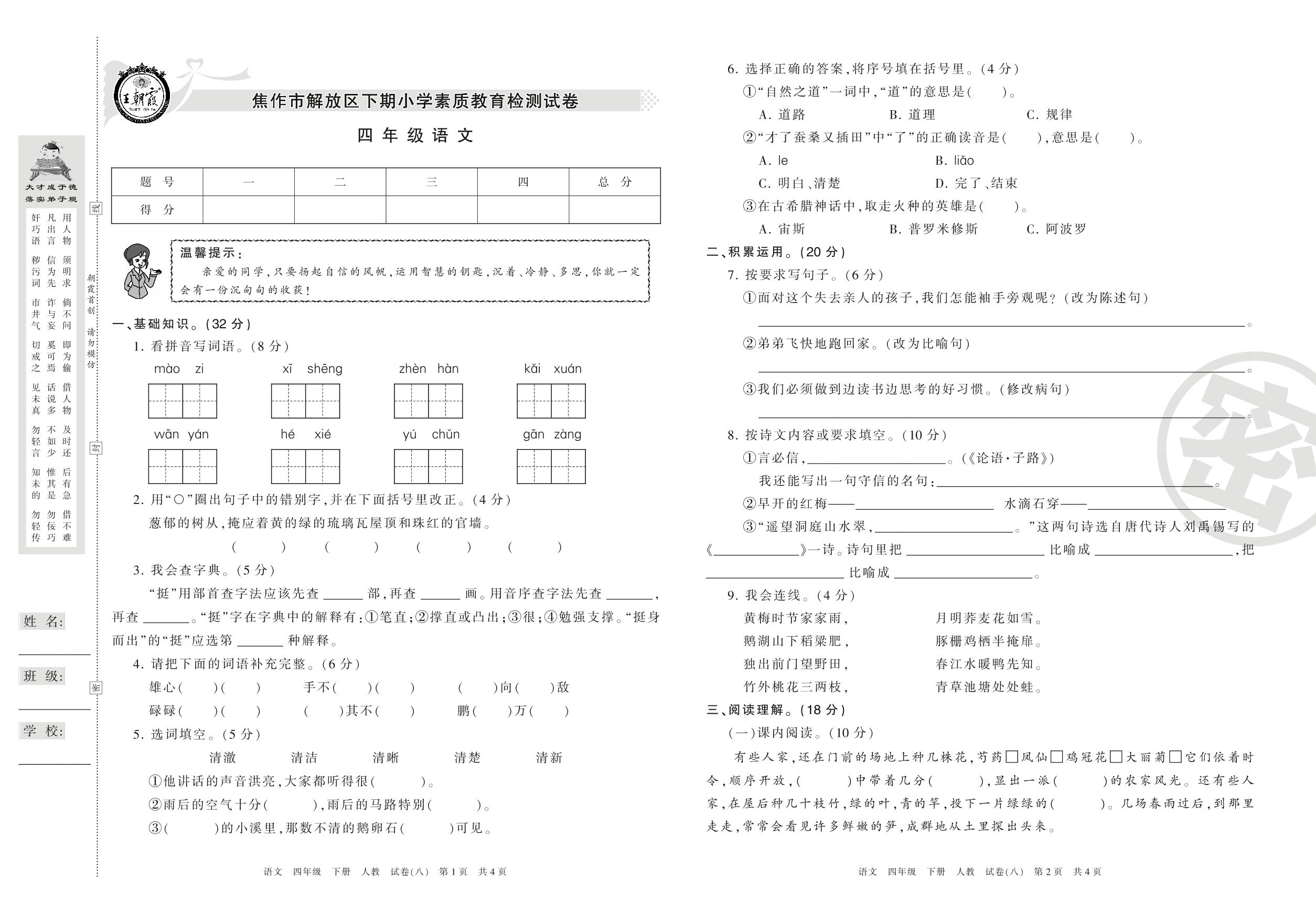 2015-2016学年第二学期焦作市解放区四年级语文试卷(人教版)【8】