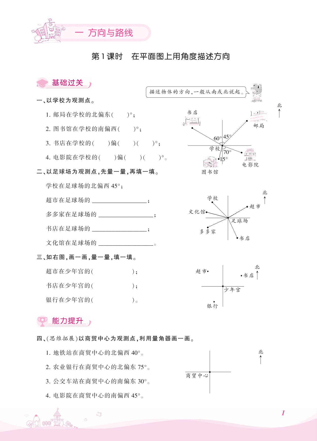2021上册五年级数学冀教版 一 方向与路线——第1课时 在平面图上用角度描述方向