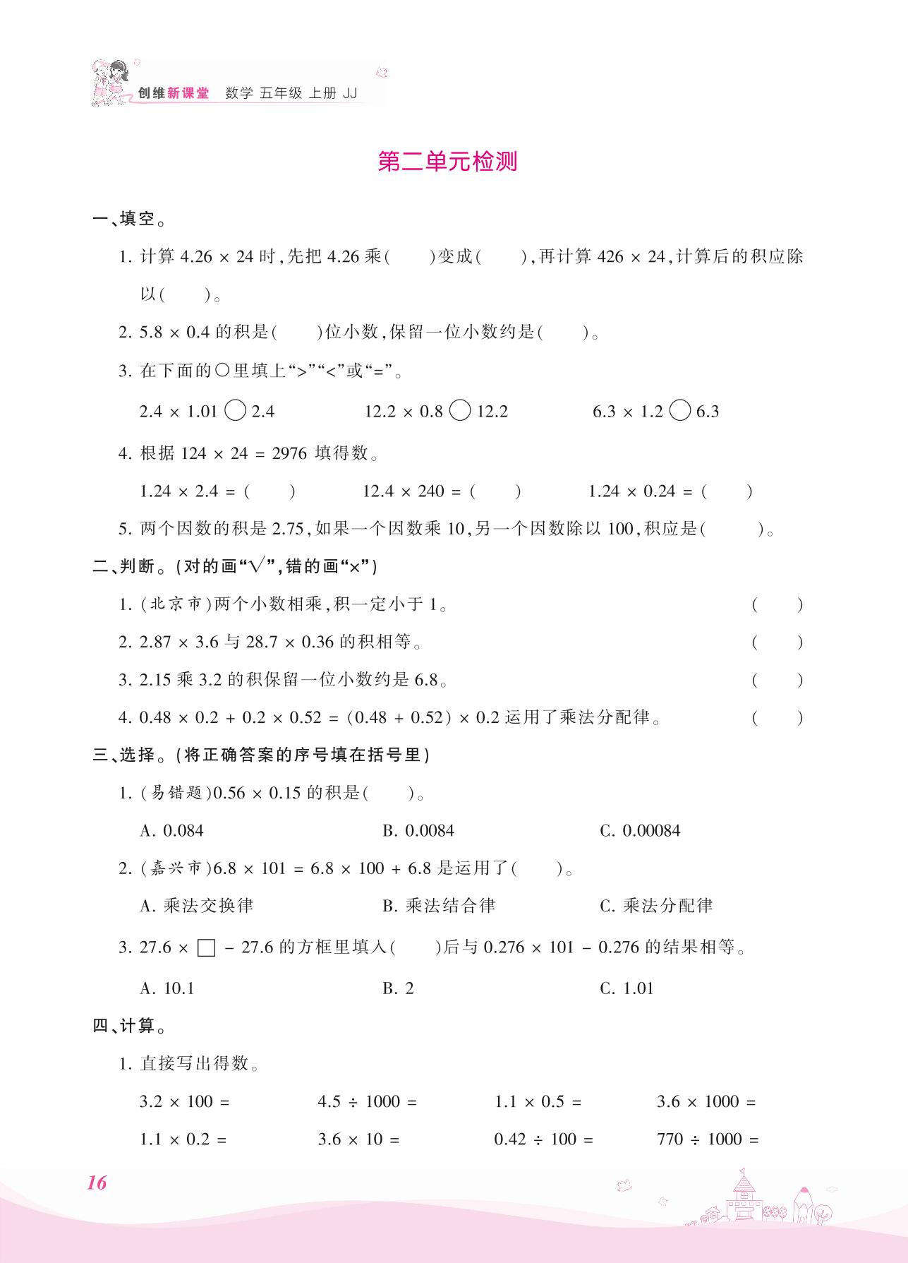 2021上册五年级数学冀教版 二 小数乘法——第二单元检测