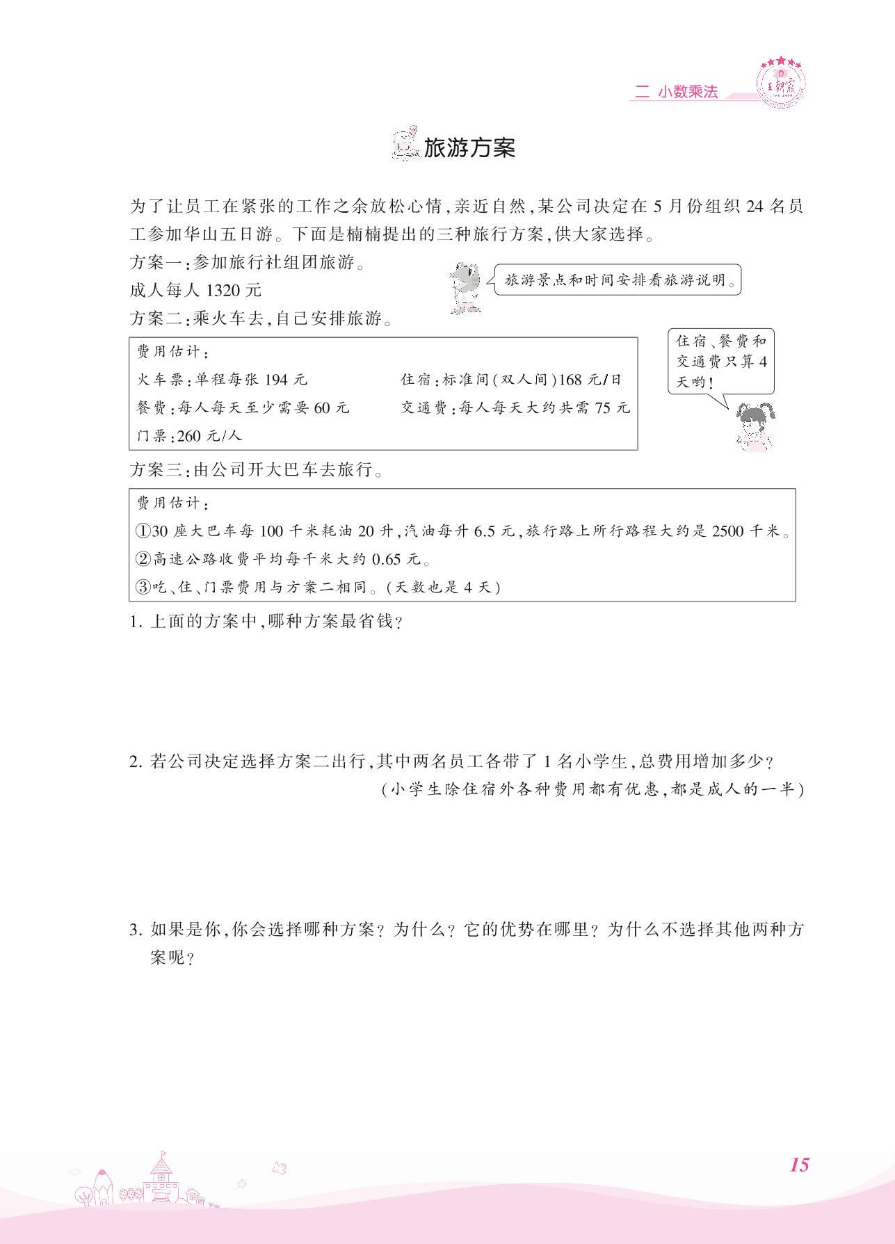 2021上册五年级数学冀教版 二 小数乘法——旅游方案