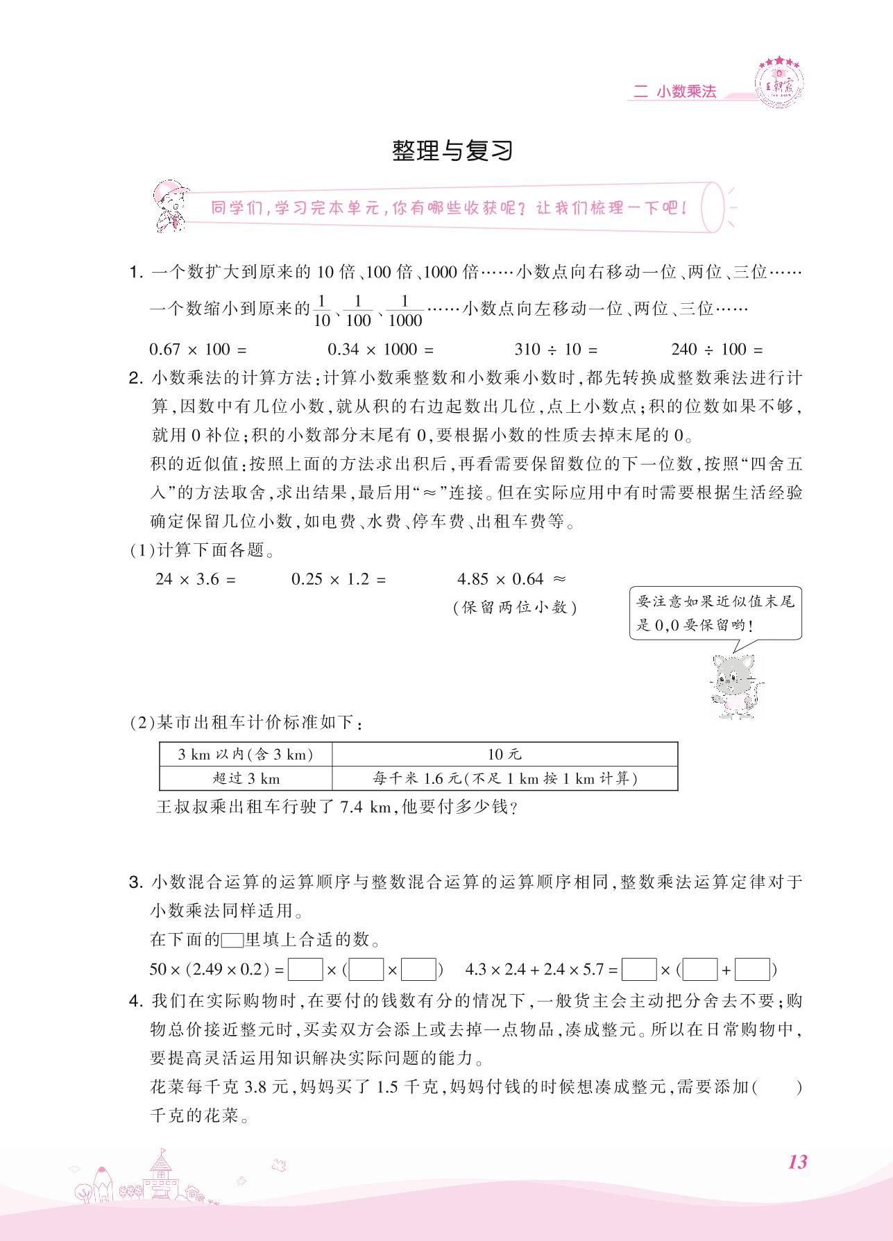 2021上册五年级数学冀教版 二 小数乘法——整理与复习