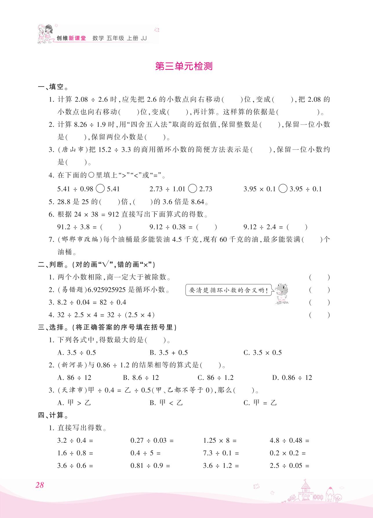 2021上册五年级数学冀教版 三 小数除法——第三单元检测