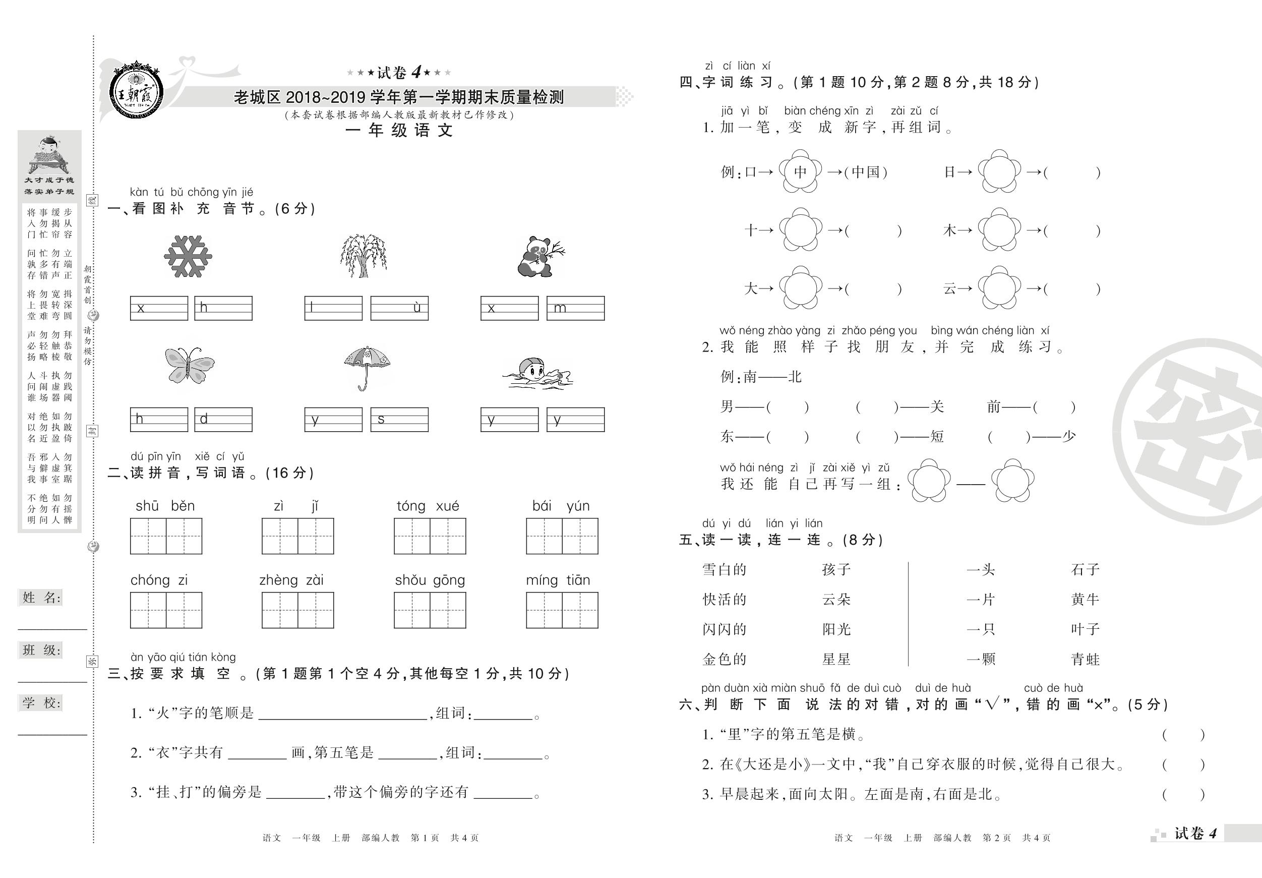 2018-2019学年第一学期洛阳市老城区一年级语文试卷(人教版)【4】