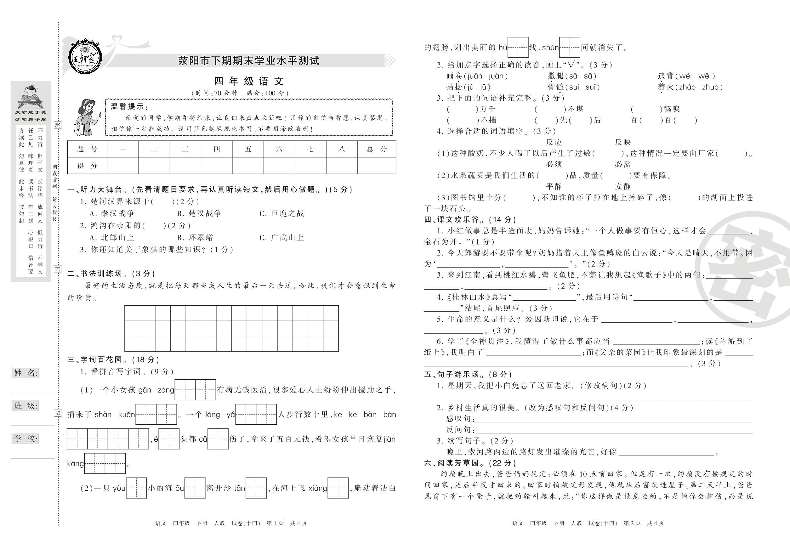 2015-2016学年第二学期荥阳市四年级语文试卷(人教版)【14】