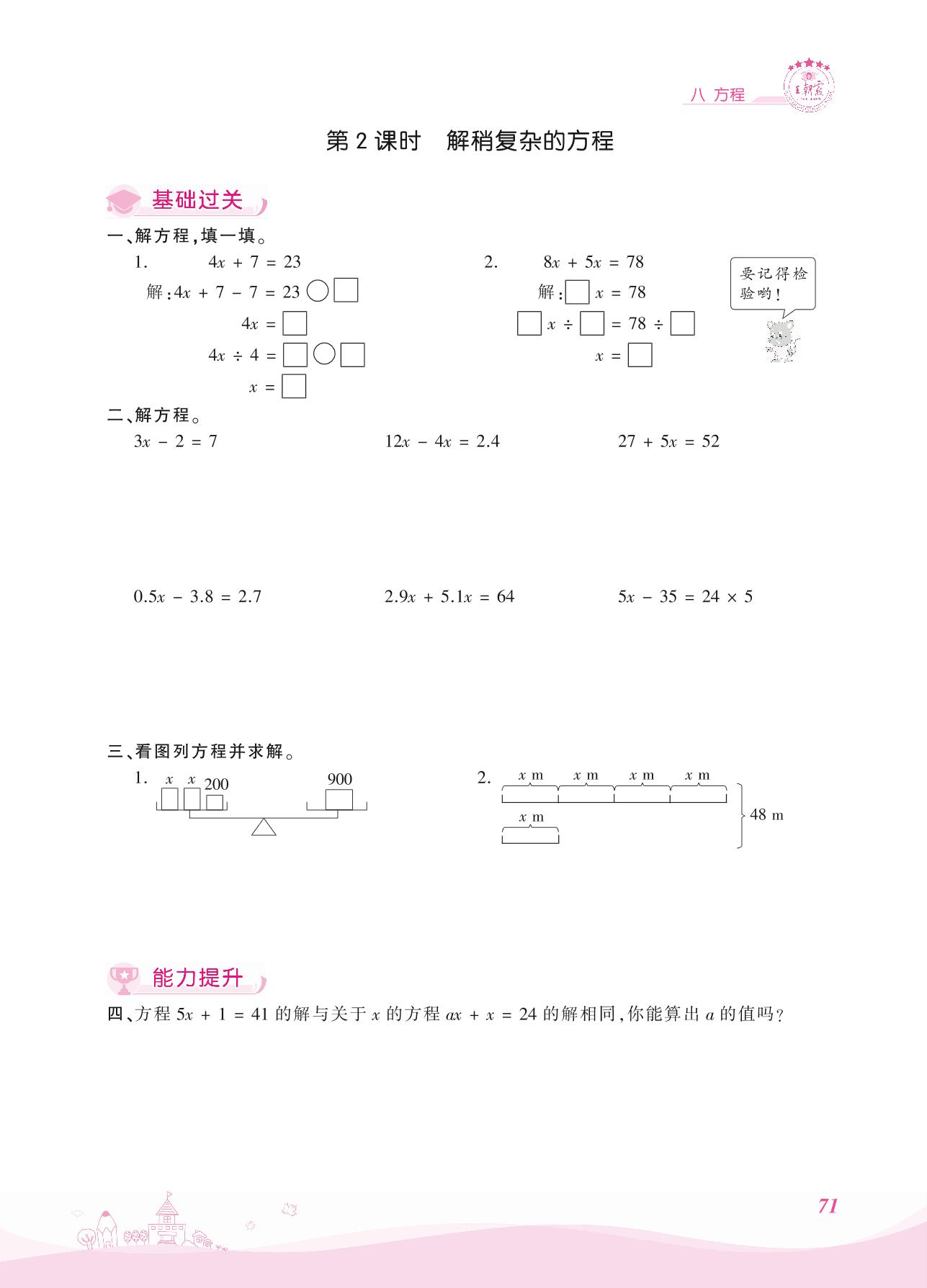 2021上册五年级数学冀教版 八 方程 3. 解方程——第2课时 解稍复杂的方程
