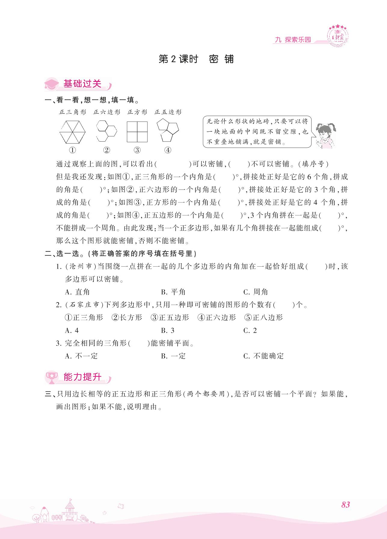 2021上册五年级数学冀教版 九 探索乐园——第2课时 密铺