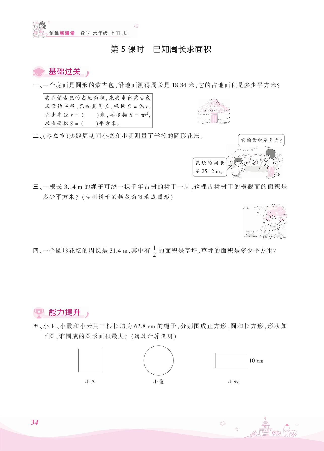 2021上册六年级数学冀教版 四 圆的周长和面积——第5课时 已知周长求面积