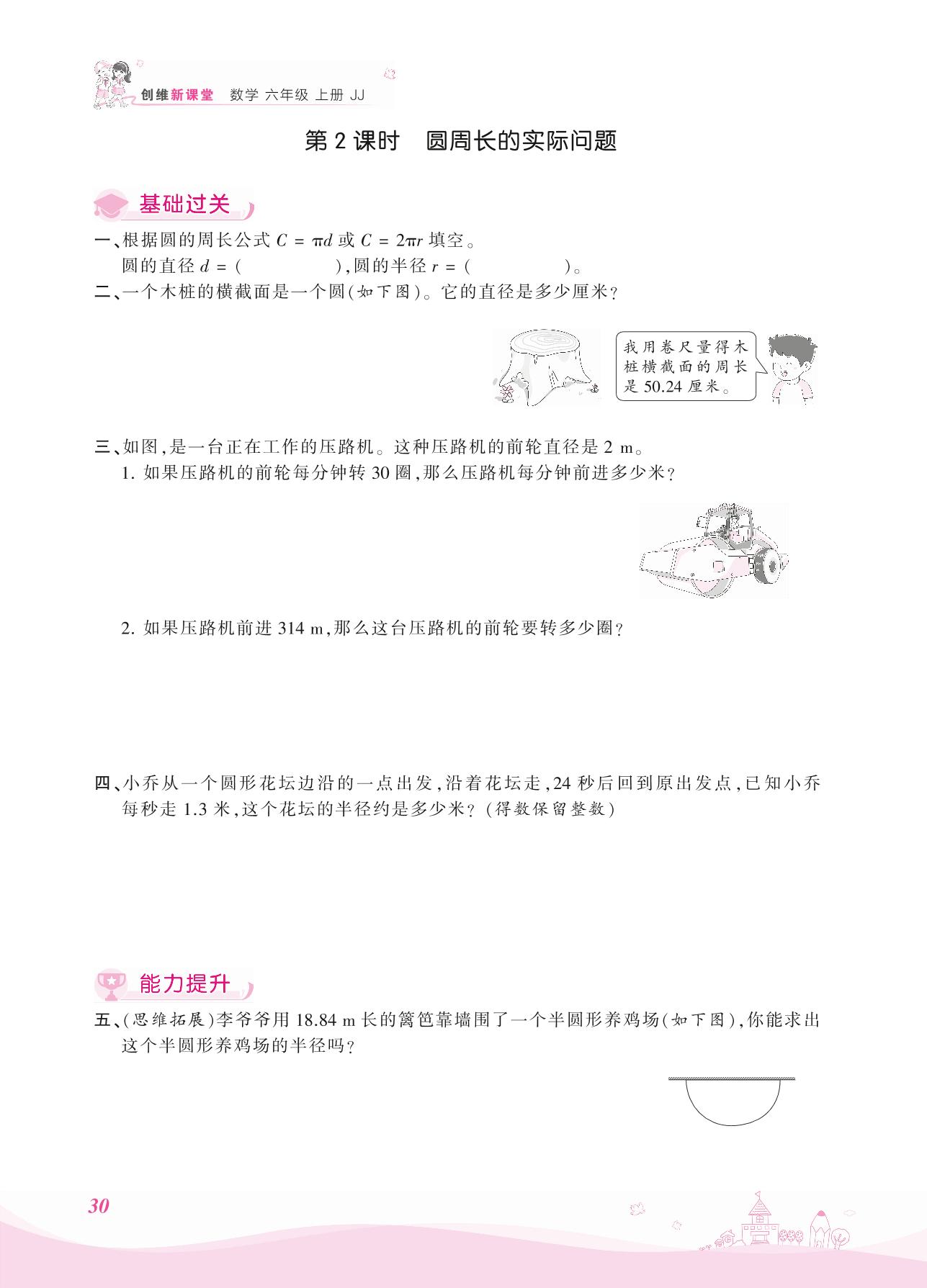 2021上册六年级数学冀教版 四 圆的周长和面积——第2课时 圆周长的实际问题