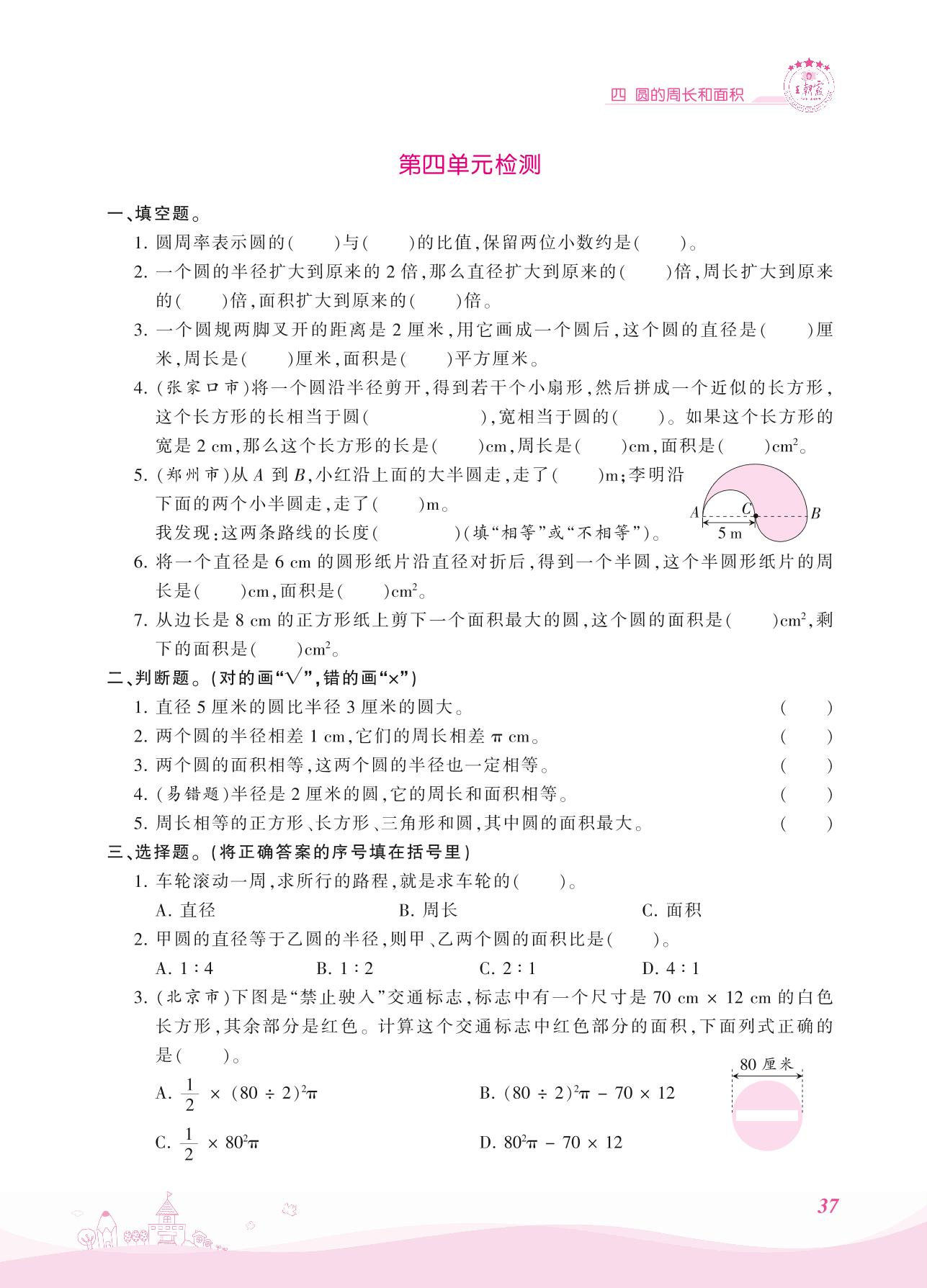 2021上册六年级数学冀教版 四 圆的周长和面积——第四单元检测