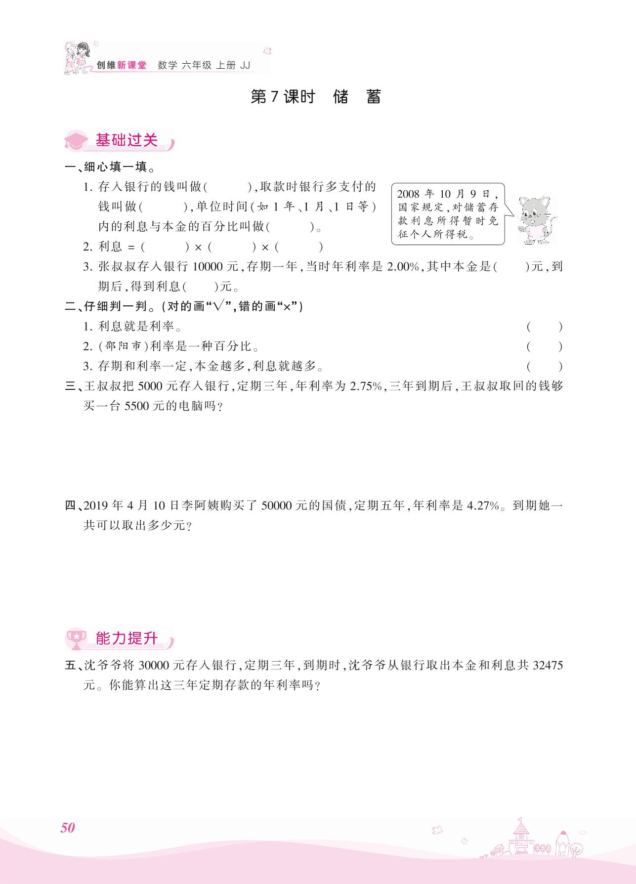 2021上册六年级数学冀教版 五 百分数的应用——第7课时 储蓄