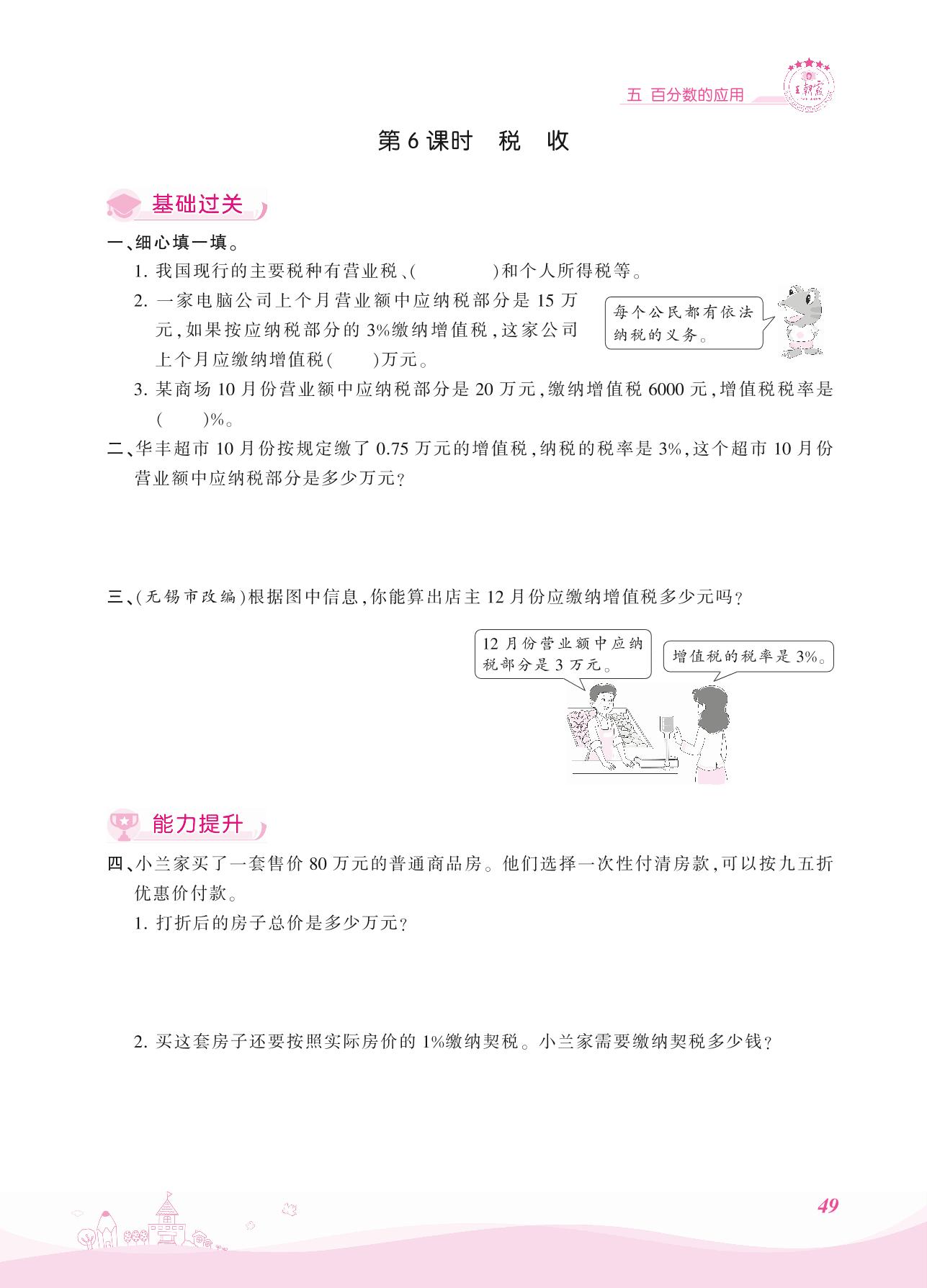 2021上册六年级数学冀教版 五 百分数的应用——第6课时 税收