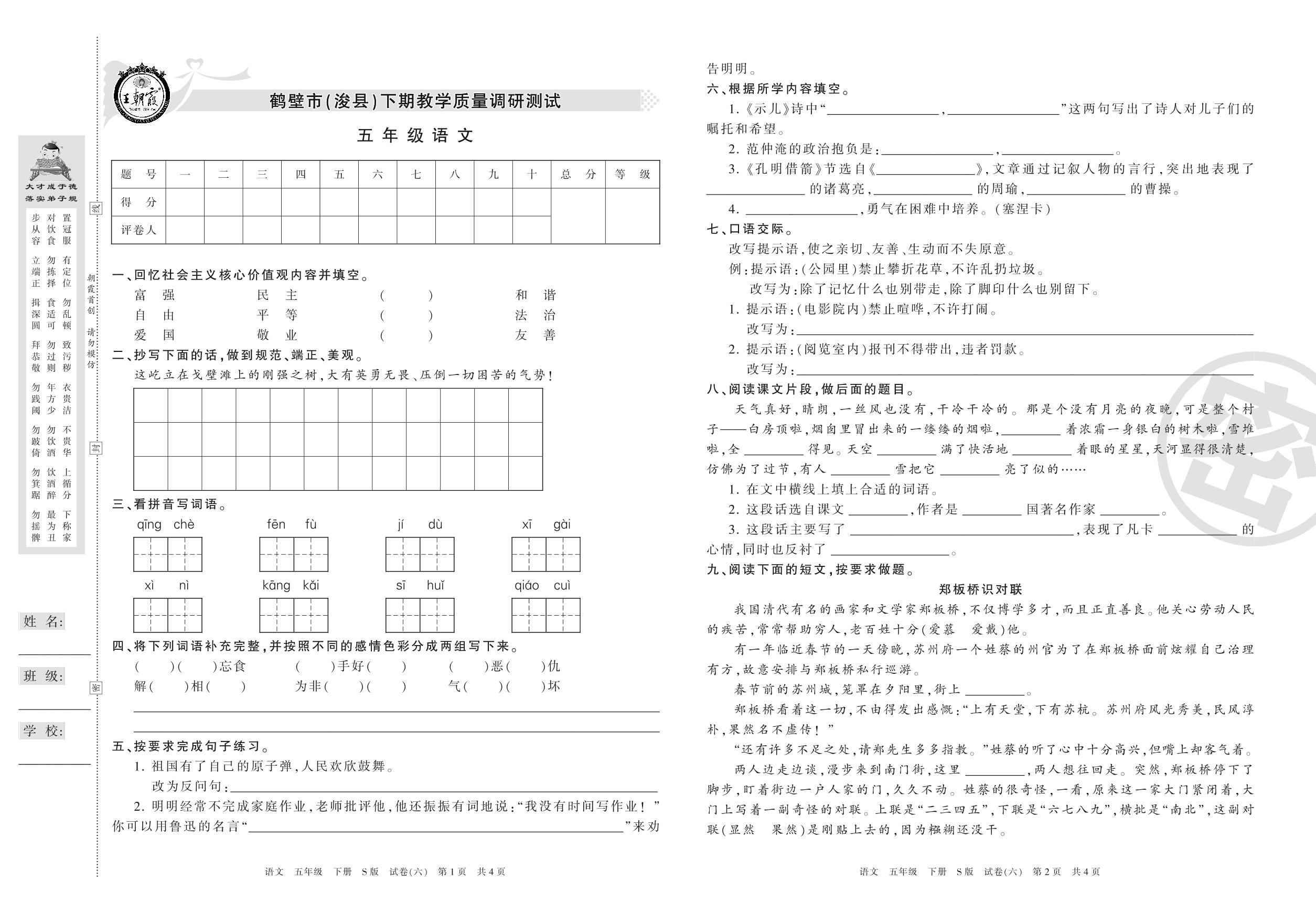 2015-2016学年第二学期鹤壁市(浚县)五年级语文试卷(S版)【6】