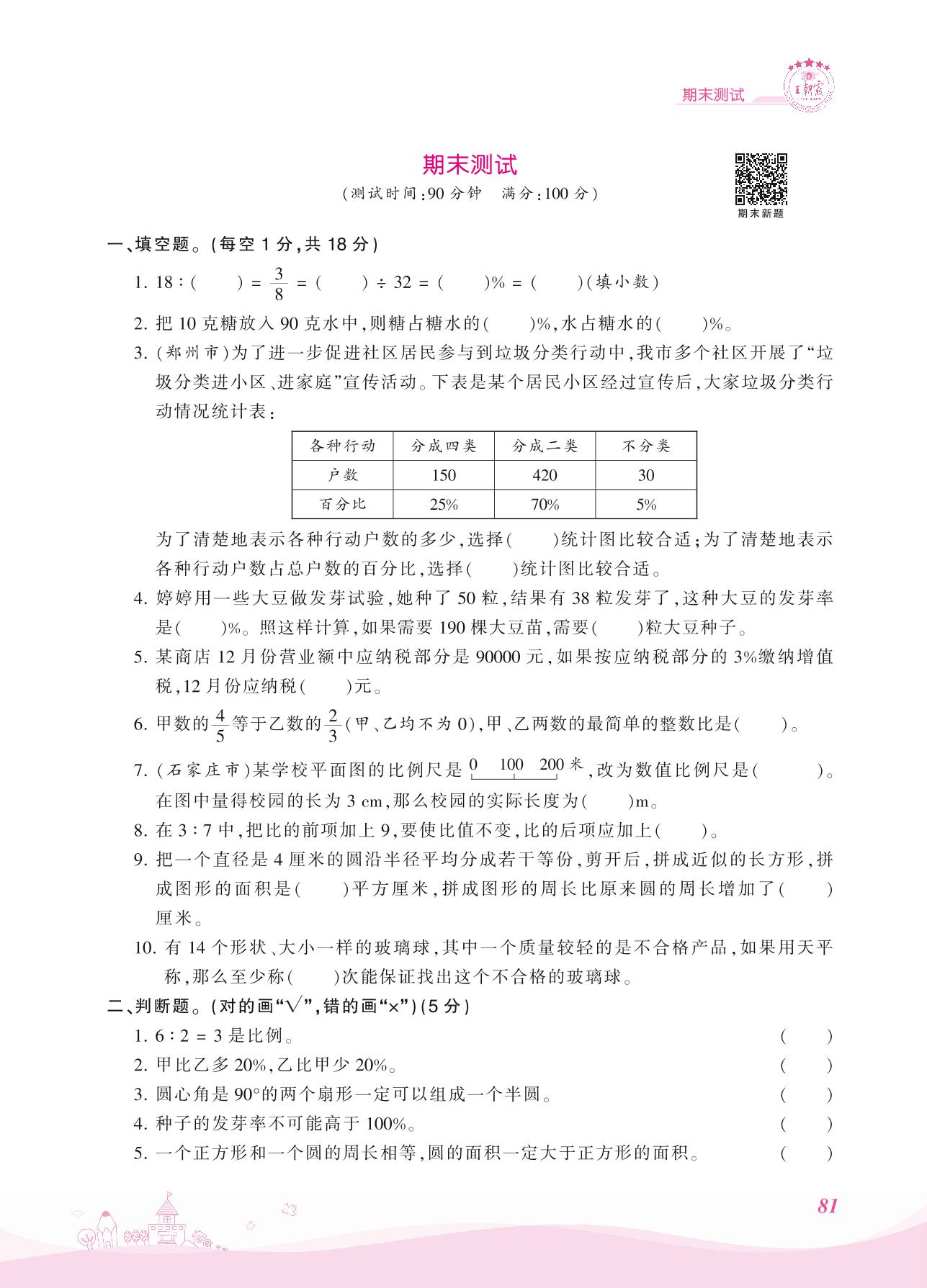 2021上册六年级数学冀教版 期末测试