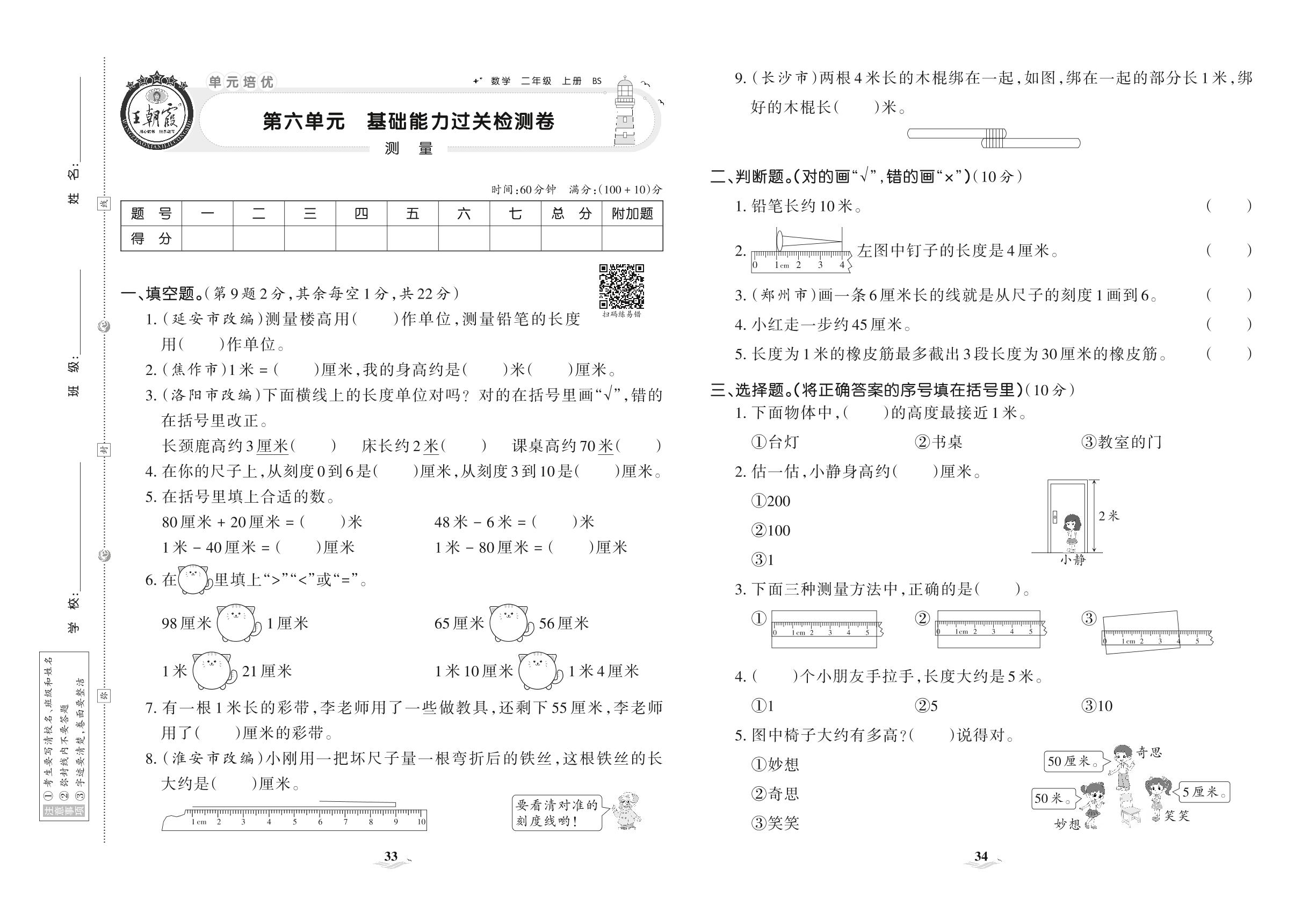 2021上册二年级数学北师版 第六单元 基础能力过关检测卷