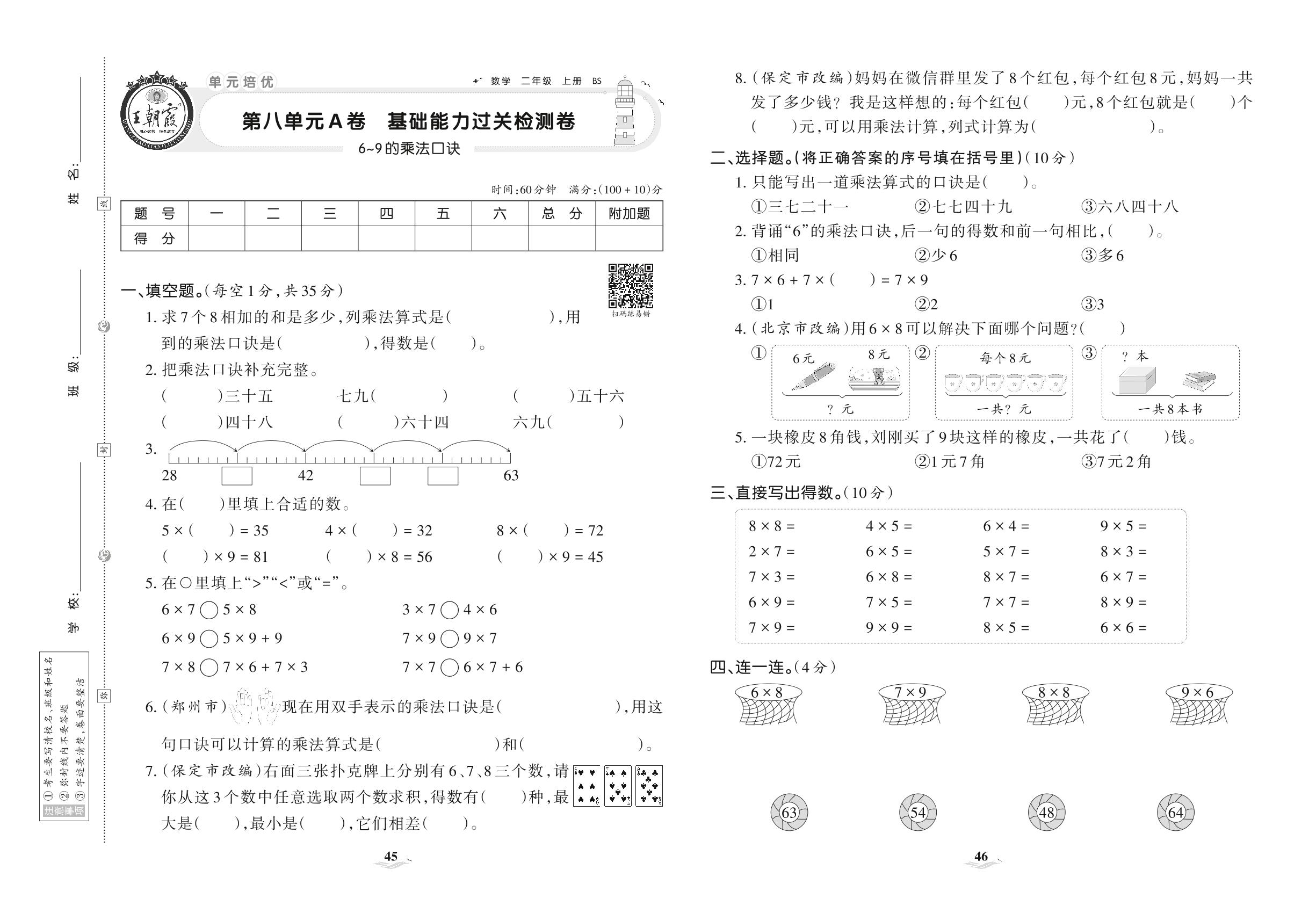 2021上册二年级数学北师版 第八单元A卷 基础能力过关检测卷