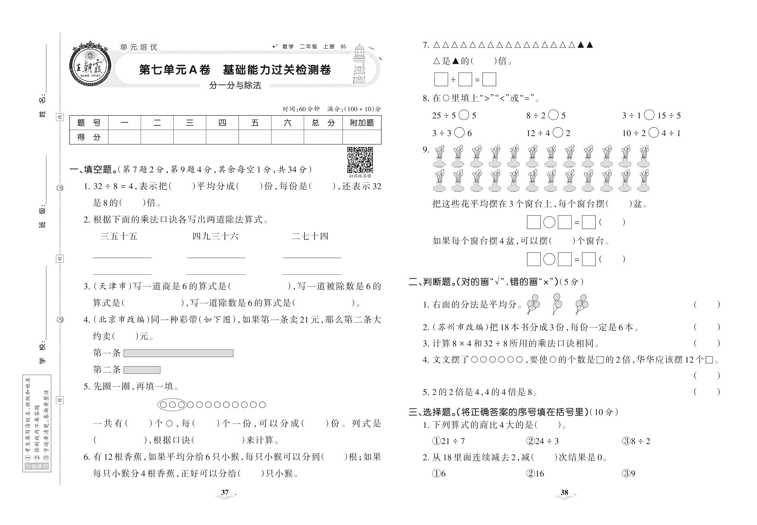 2021上册二年级数学北师版 第七单元A卷 基础能力过关检测卷