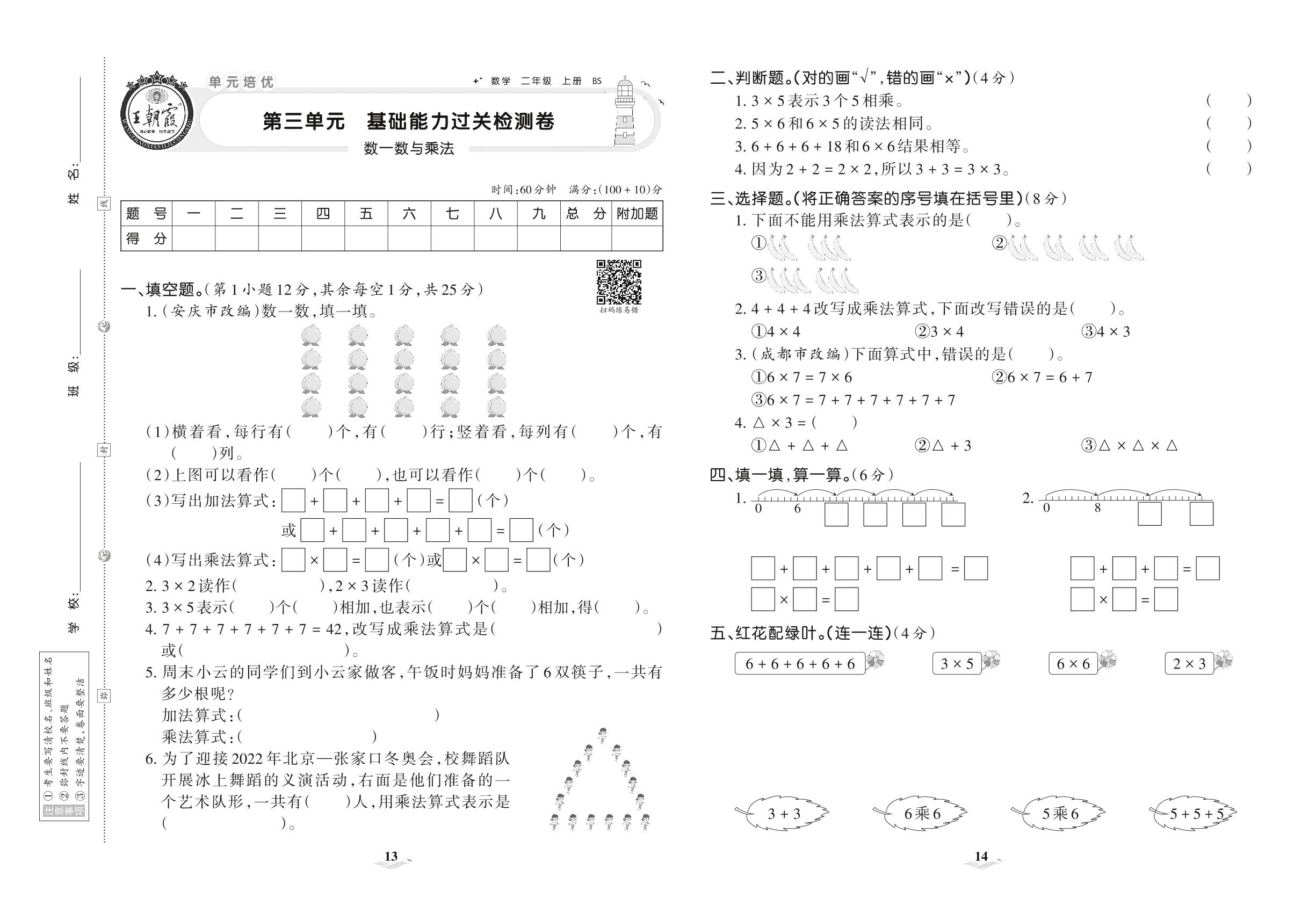 2021上册二年级数学北师版 第三单元 基础能力过关检测卷