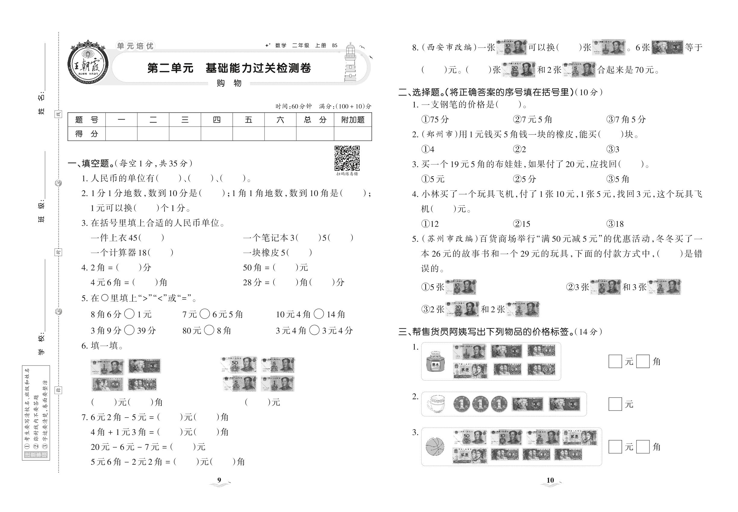 2021上册二年级数学北师版 第二单元 基础能力过关检测卷