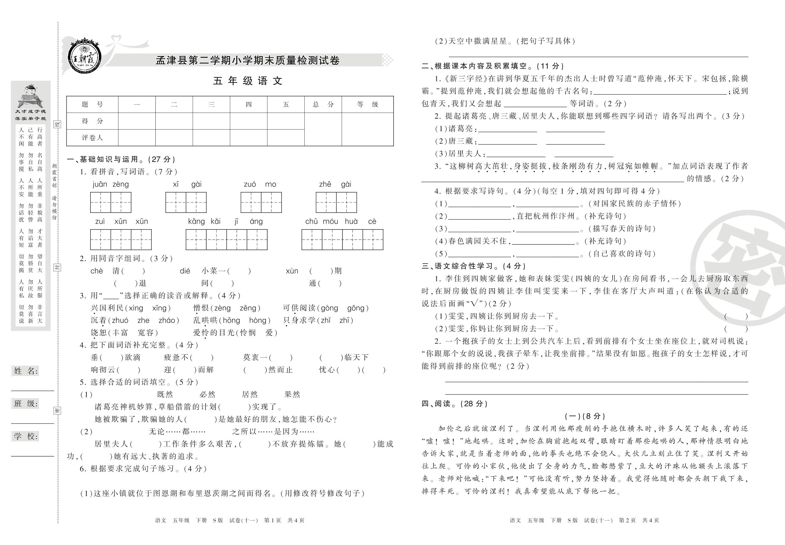 2015-2016学年第二学期洛阳市孟津县五年级语文试卷(S版)【11】