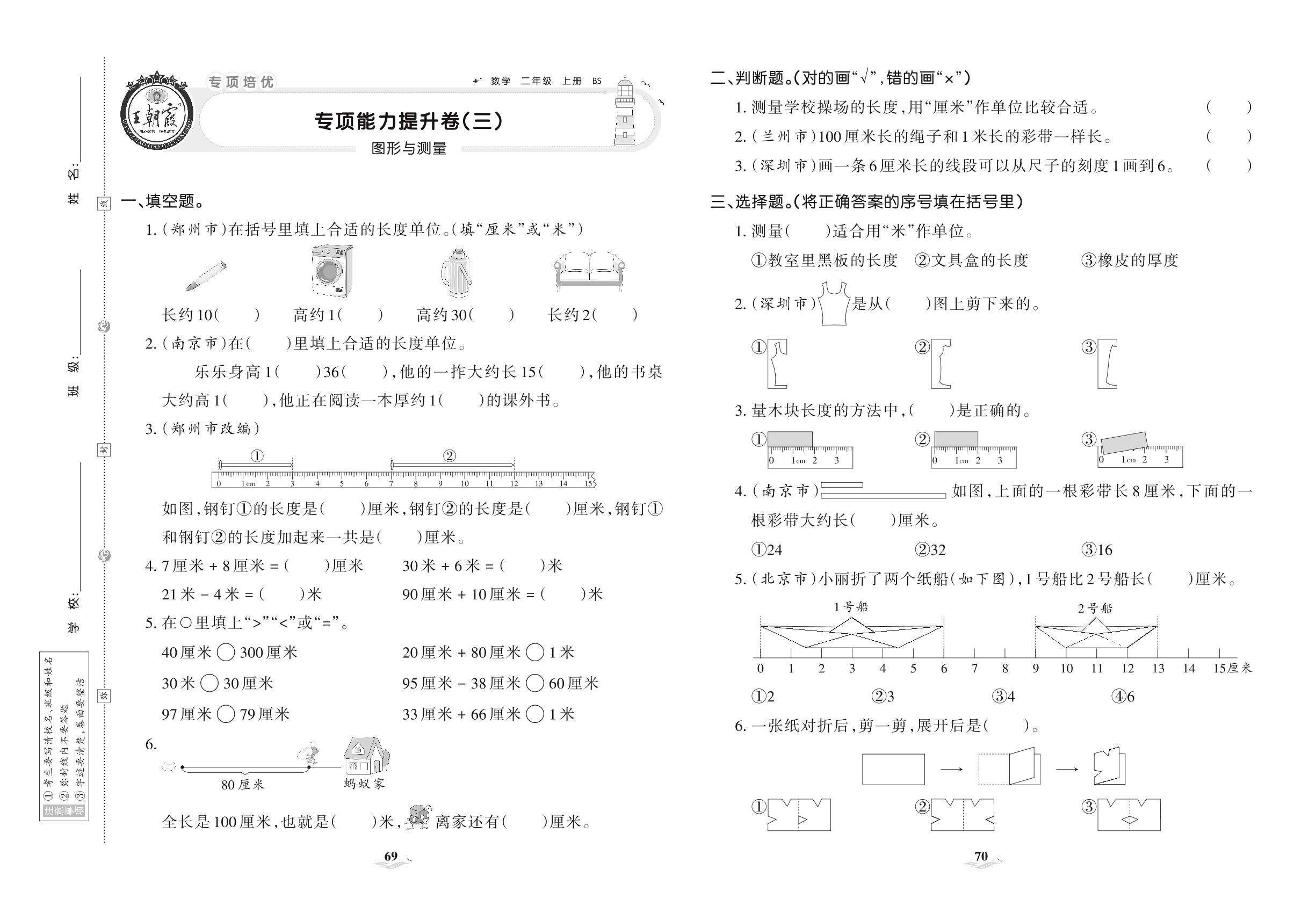 2021上册二年级数学北师版 专项能力提升卷(三) 图形与测量