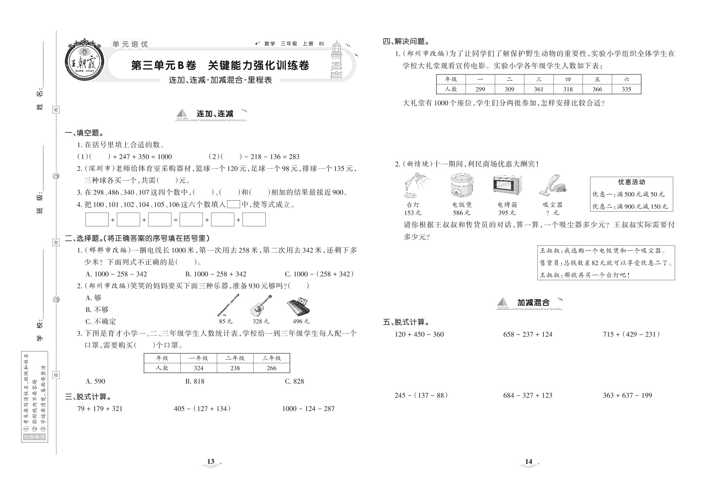2021上册三年级数学北师版 第三单元B卷 关键能力强化训练卷