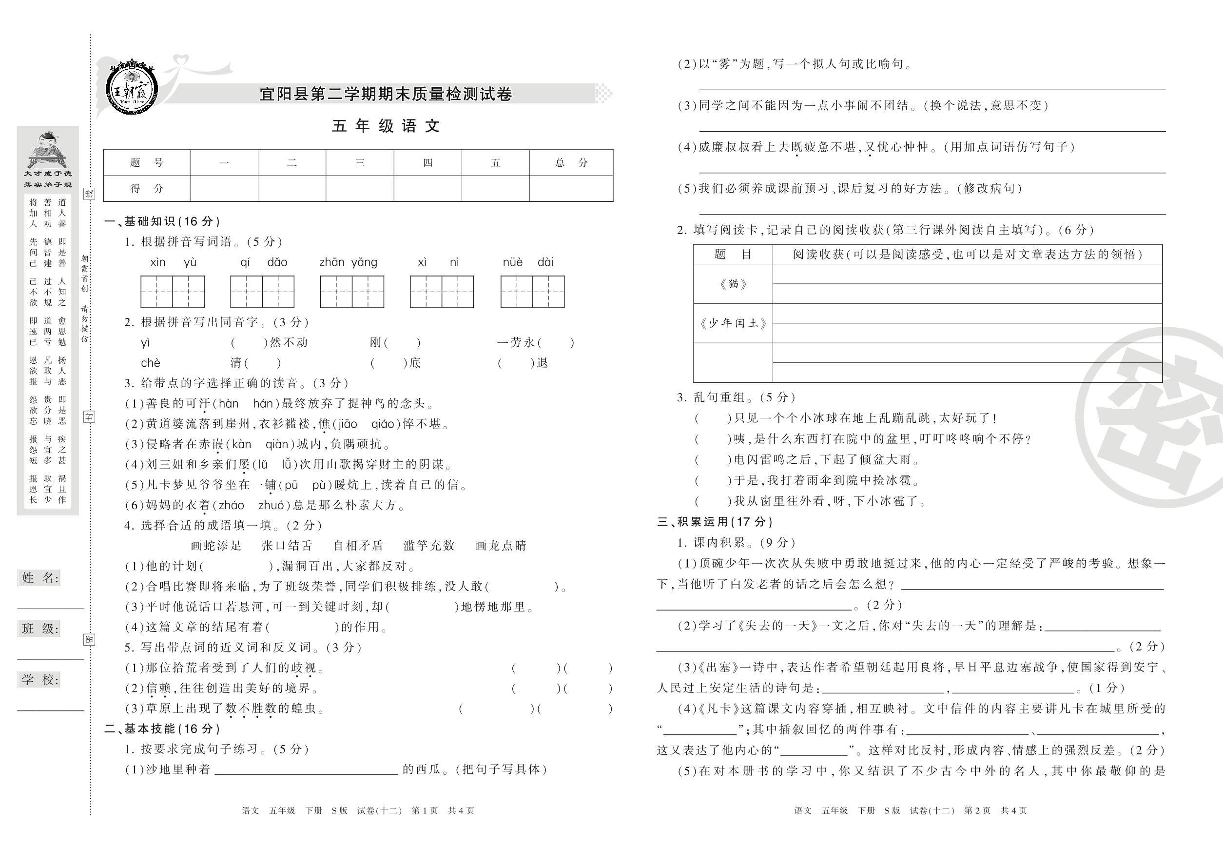 2015-2016学年第二学期洛阳市宜阳县五年级语文试卷(S版)【12】