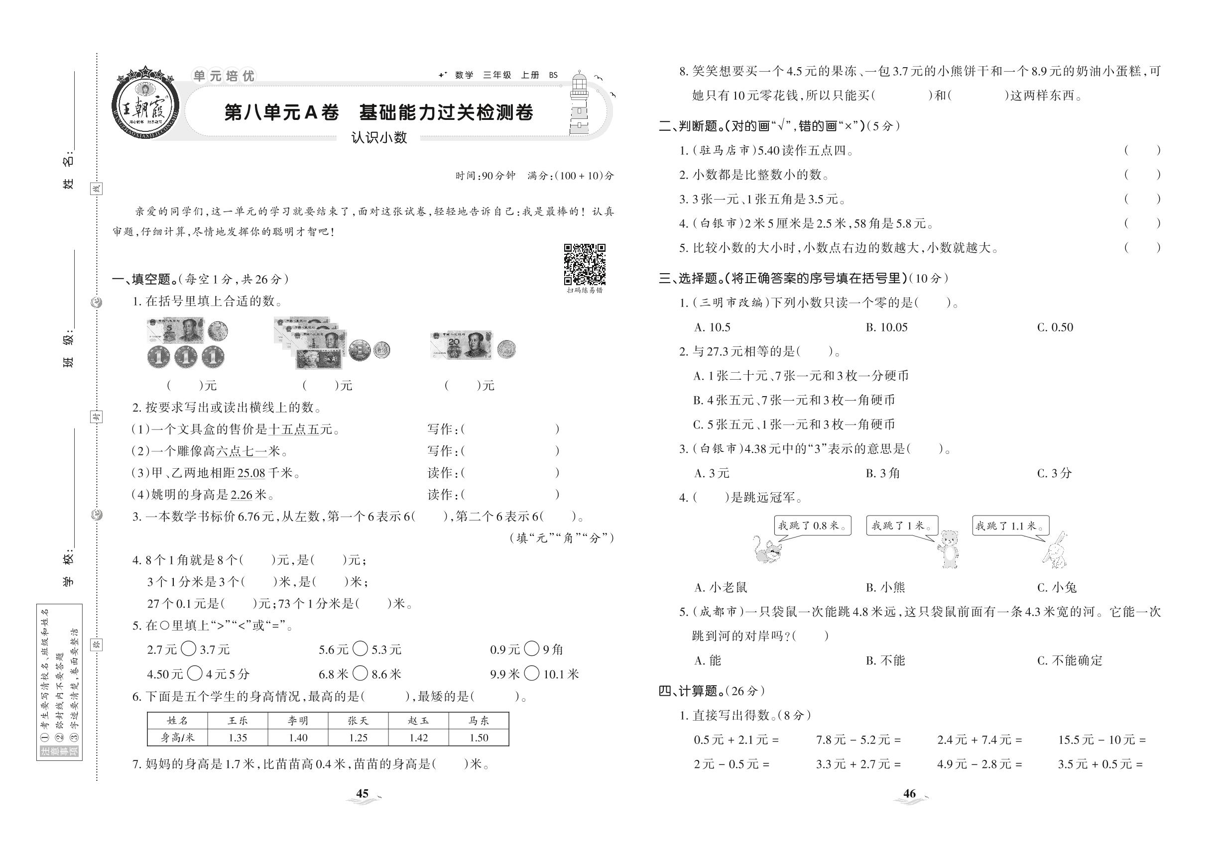 2021上册三年级数学北师版 第八单元A卷 基础能力过关检测卷
