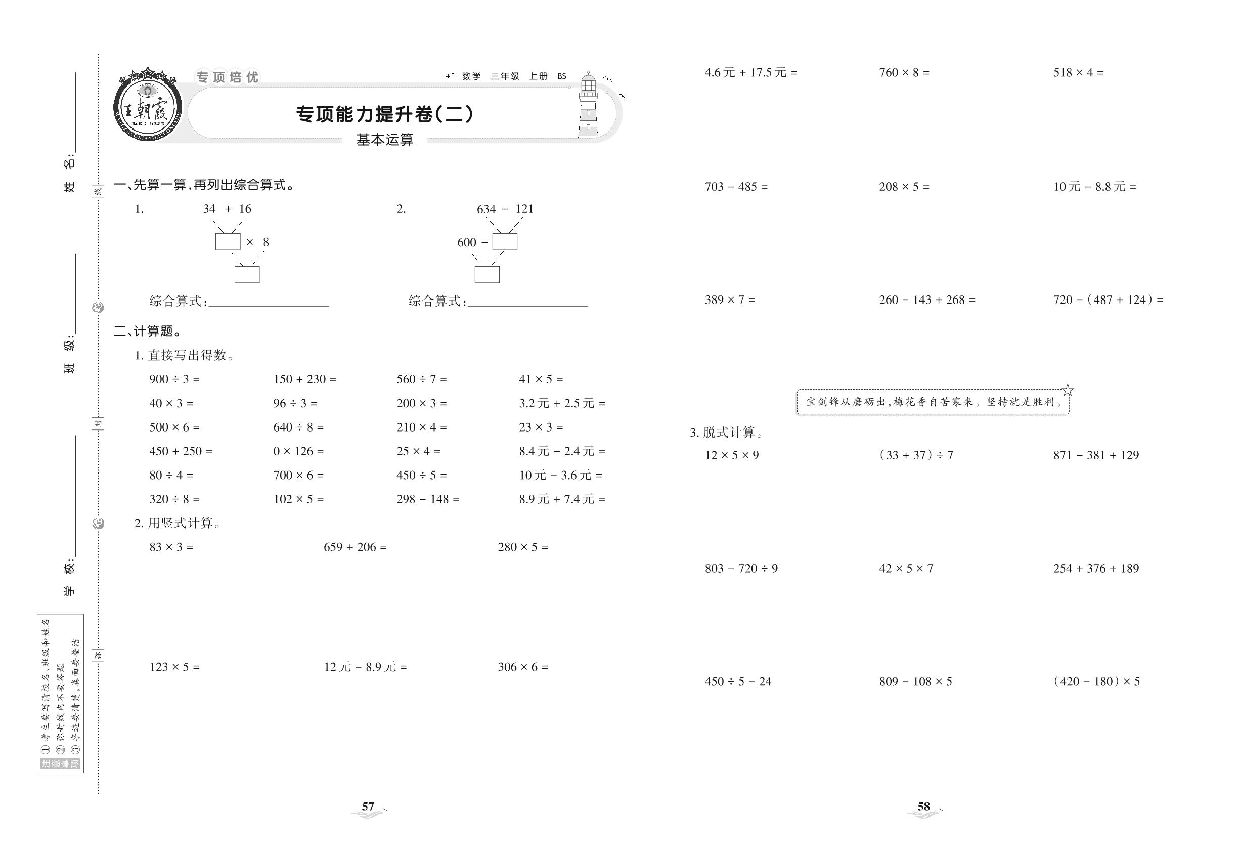 2021上册三年级数学北师版 专项能力提升卷(二) 基本运算