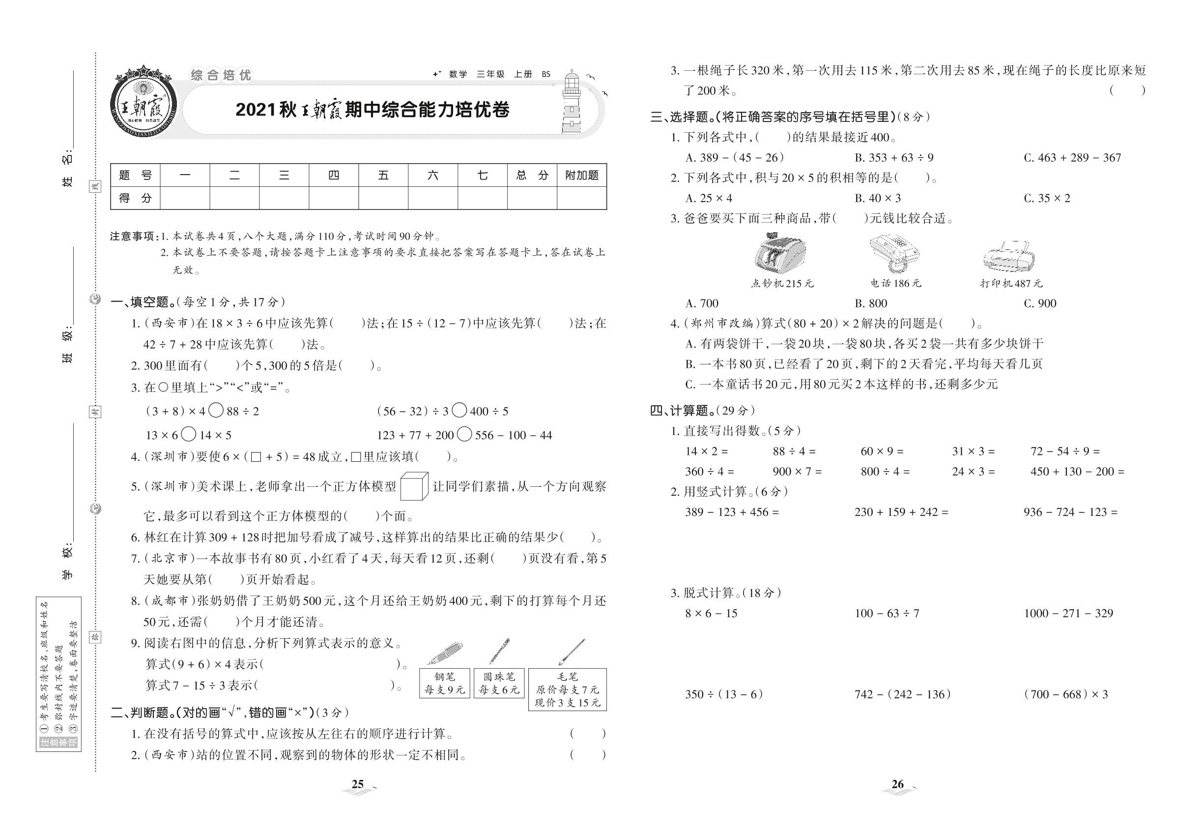2021上册三年级数学北师版 王朝霞期中综合能力培优卷