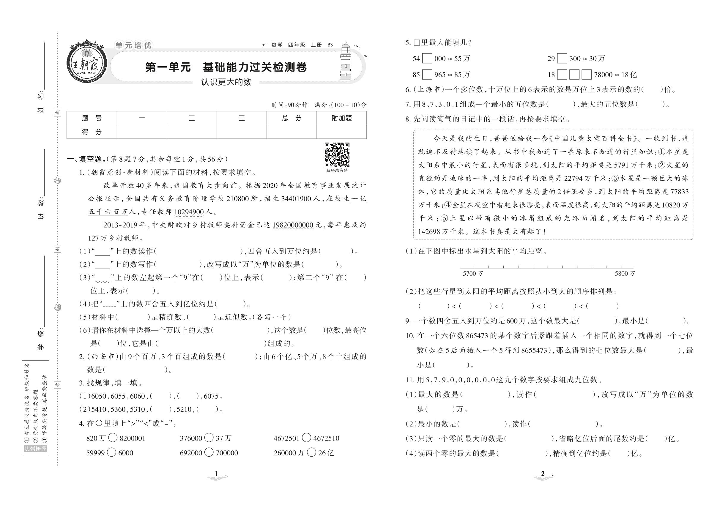 2021上册四年级数学北师版 第一单元 基础能力过关检测卷