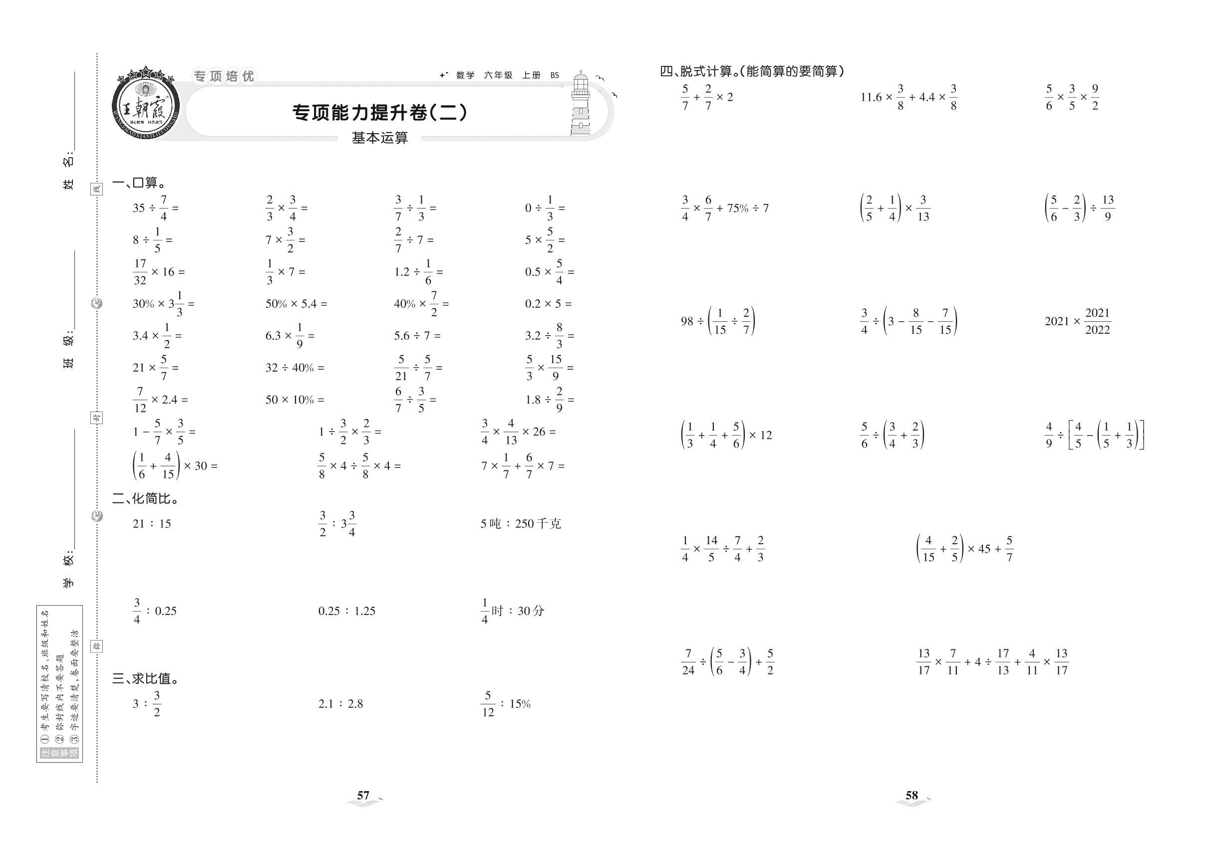 2021上册六年级数学北师版 专项能力提升卷(二) 基本运算