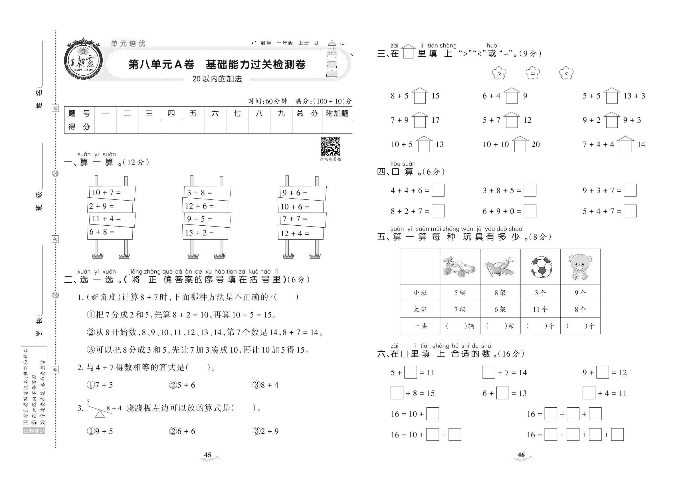 2021上册一年级数学冀教版 第八单元A卷 基础能力过关检测卷_R211214141057376