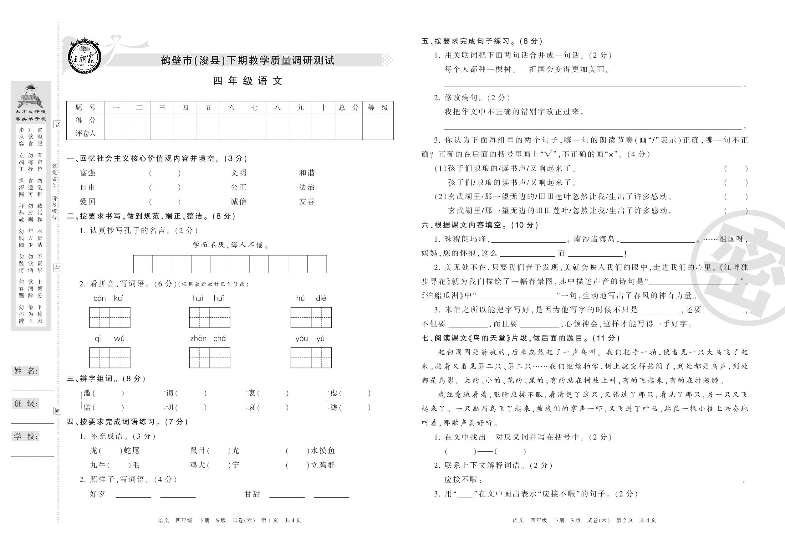 2015-2016学年第二学期鹤壁市(浚县)四年级语文试卷(S版)【6】