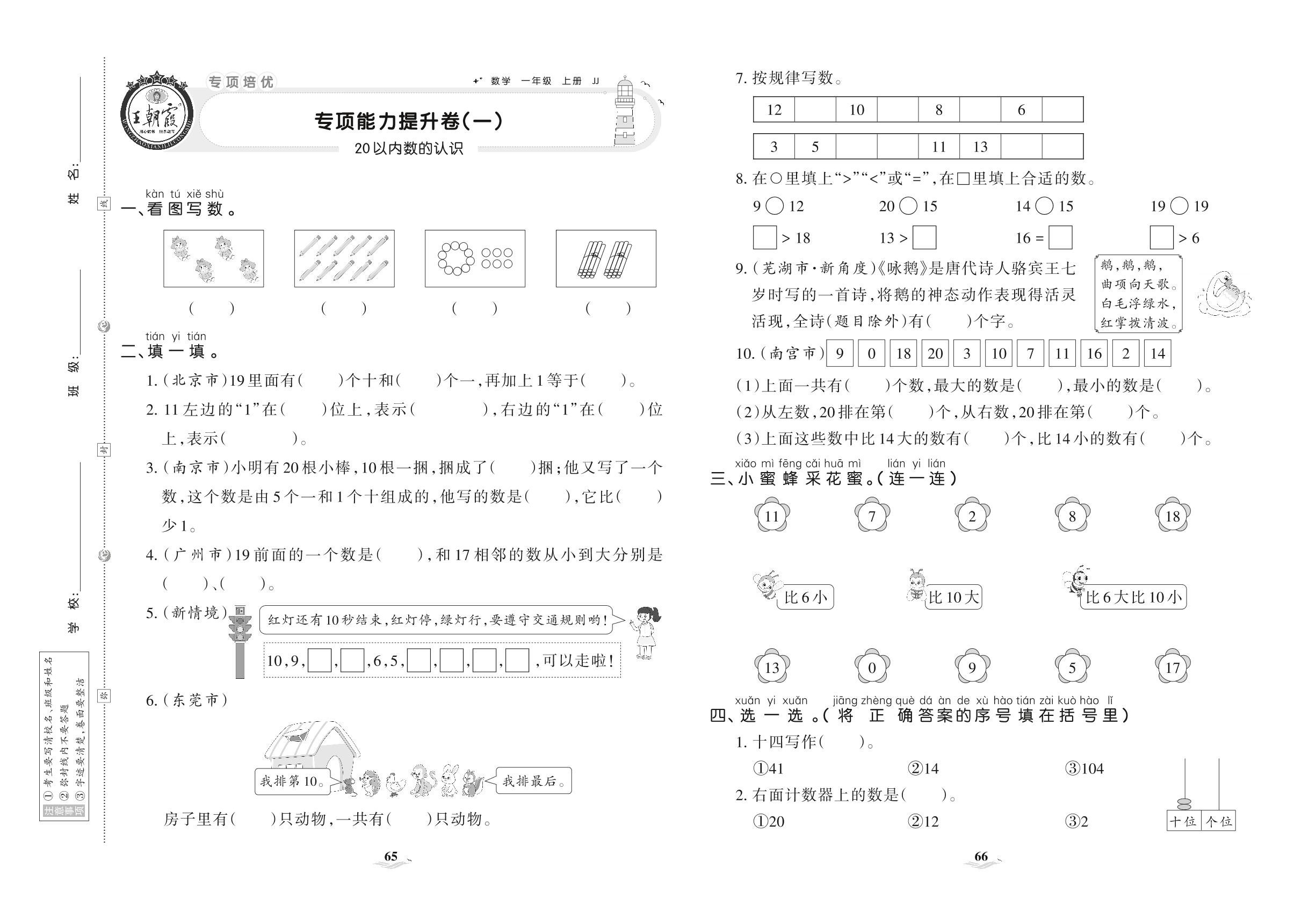 2021上册一年级数学冀教版 专项能力提升卷(一) 20以内数的认识