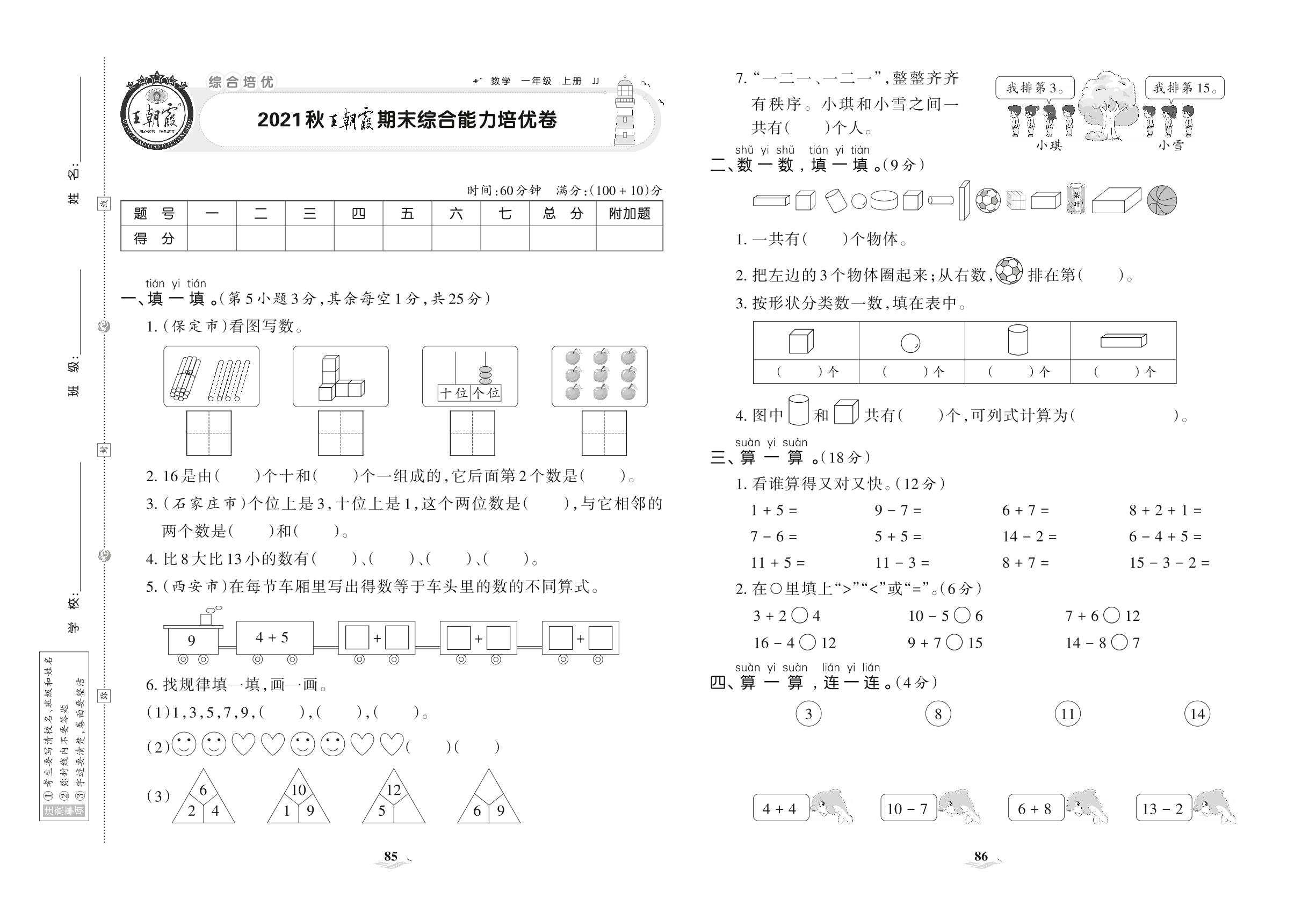 2021上册一年级数学冀教版 王朝霞期末综合能力培优卷