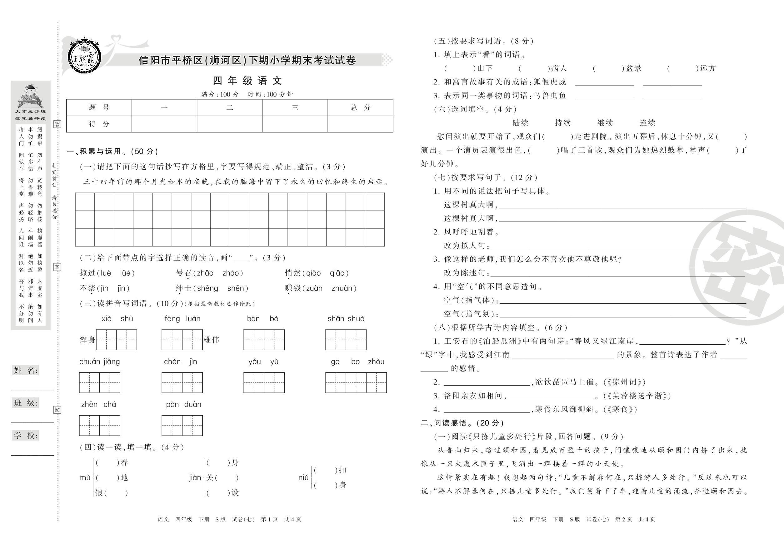2015-2016学年第二学期信阳市平桥区(浉河区)四年级语文试卷(S版)【7】