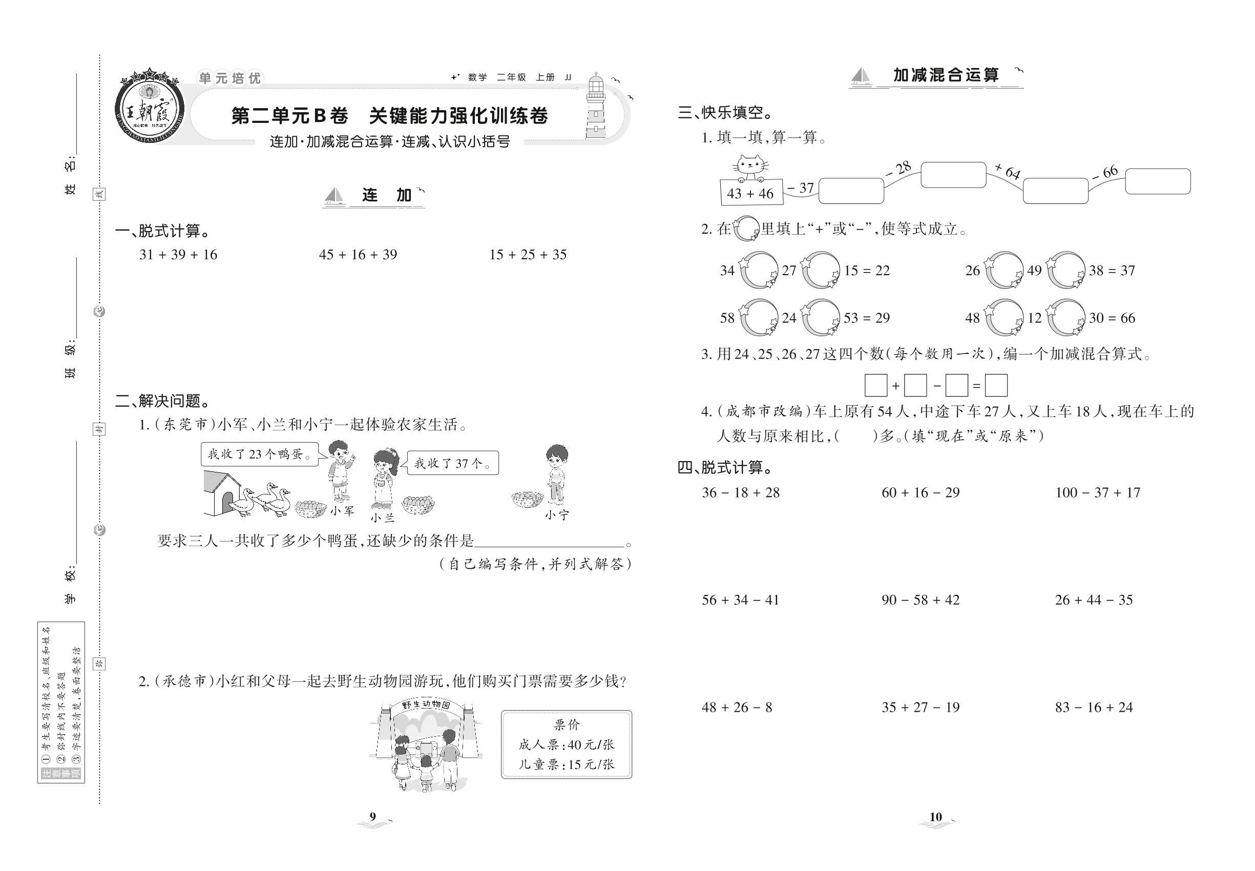2021上册二年级数学冀教版 第二单元B卷 关键能力强化训练卷