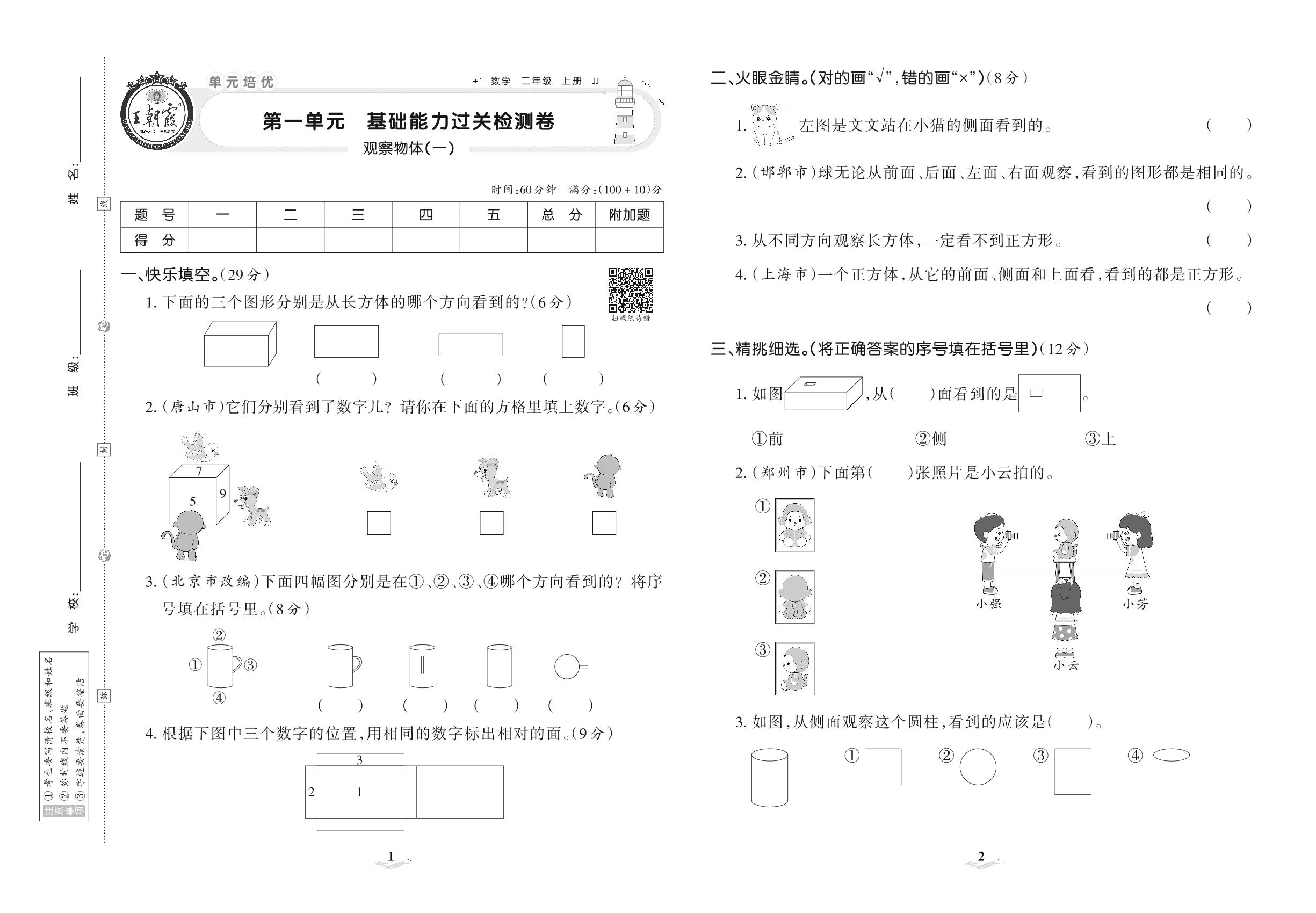 2021上册二年级数学冀教版 第一单元 基础能力过关检测卷