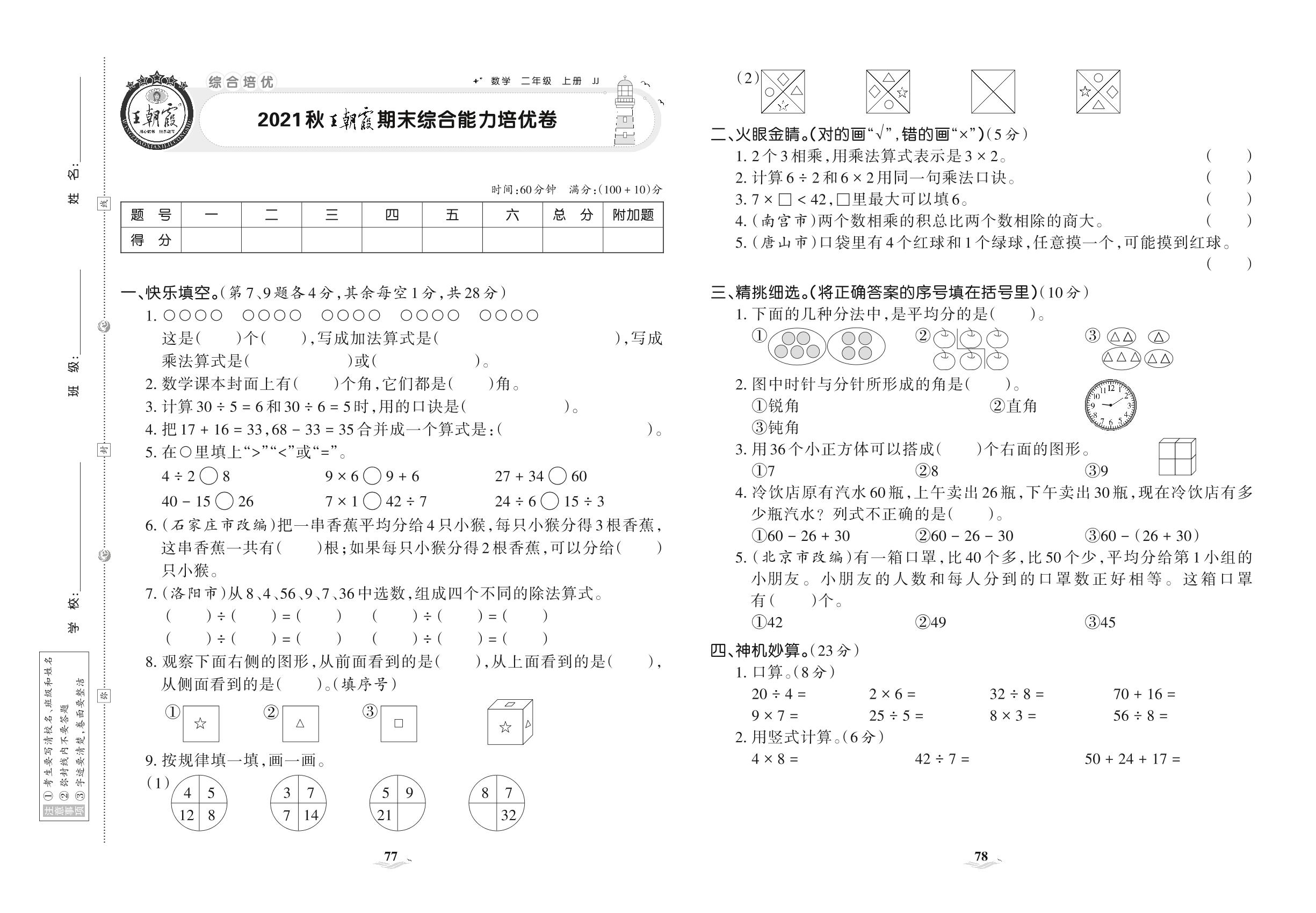 2021上册二年级数学冀教版 王朝霞期末综合能力培优卷