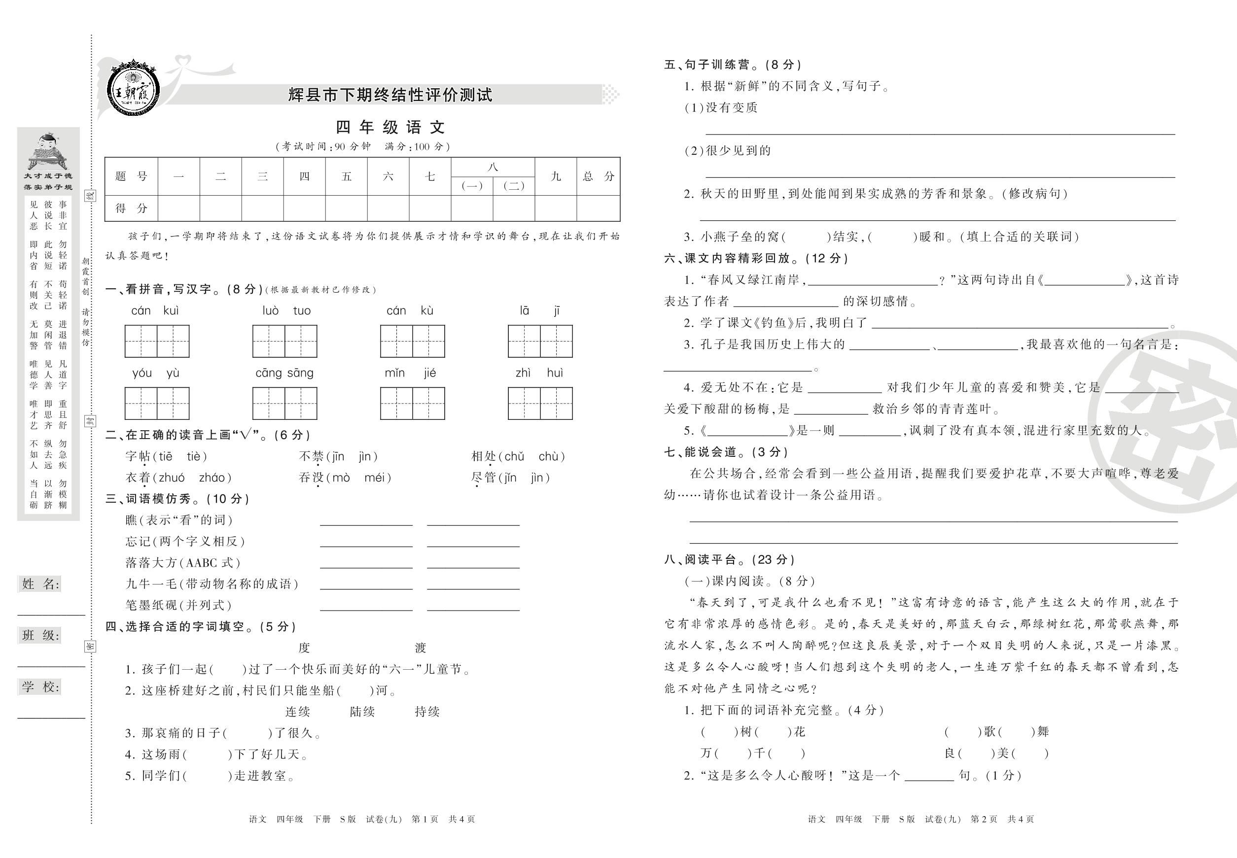 四年级语文S版下册期末卷