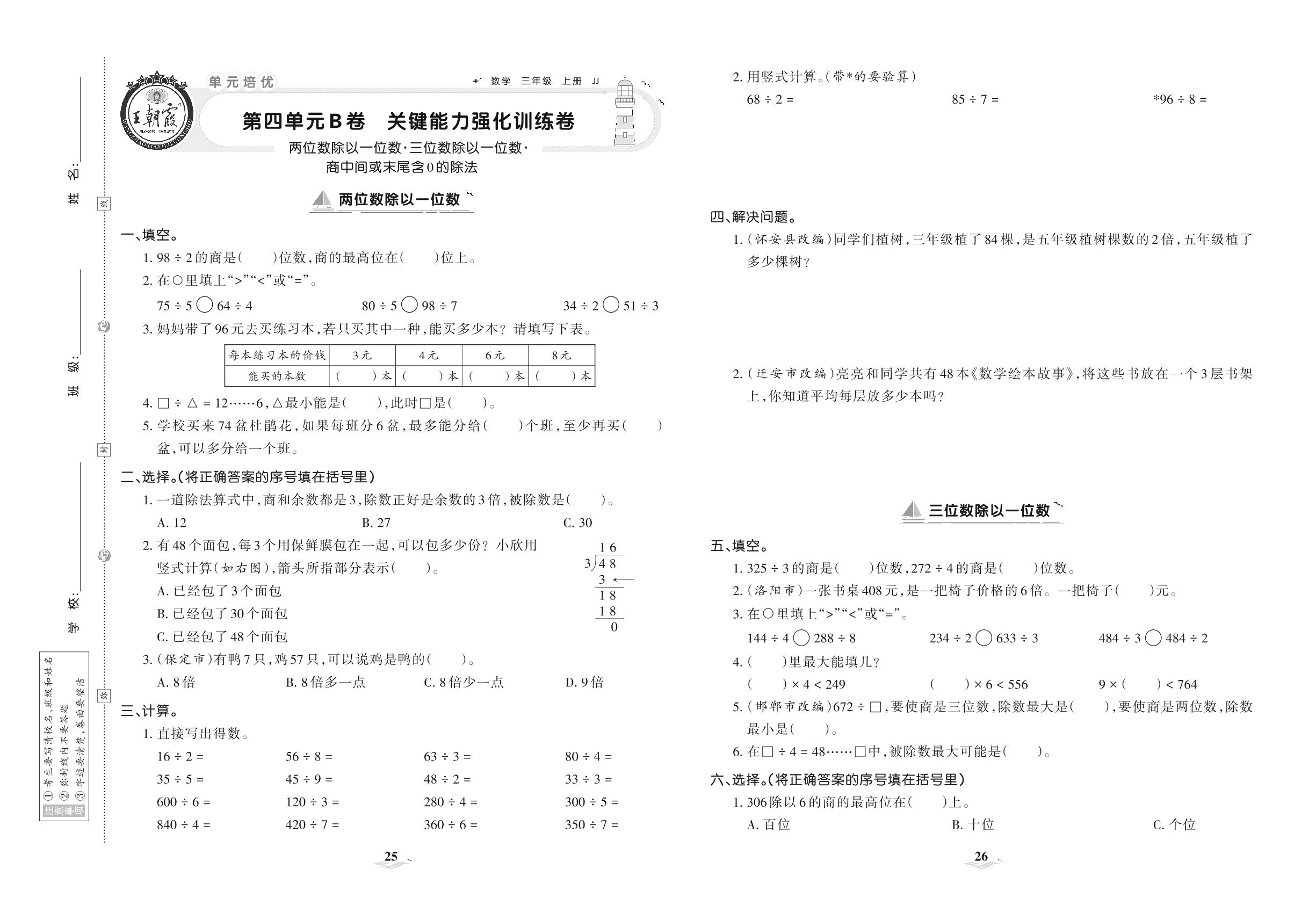 2021上册三年级数学冀教版 第四单元B卷 关键能力强化训练卷