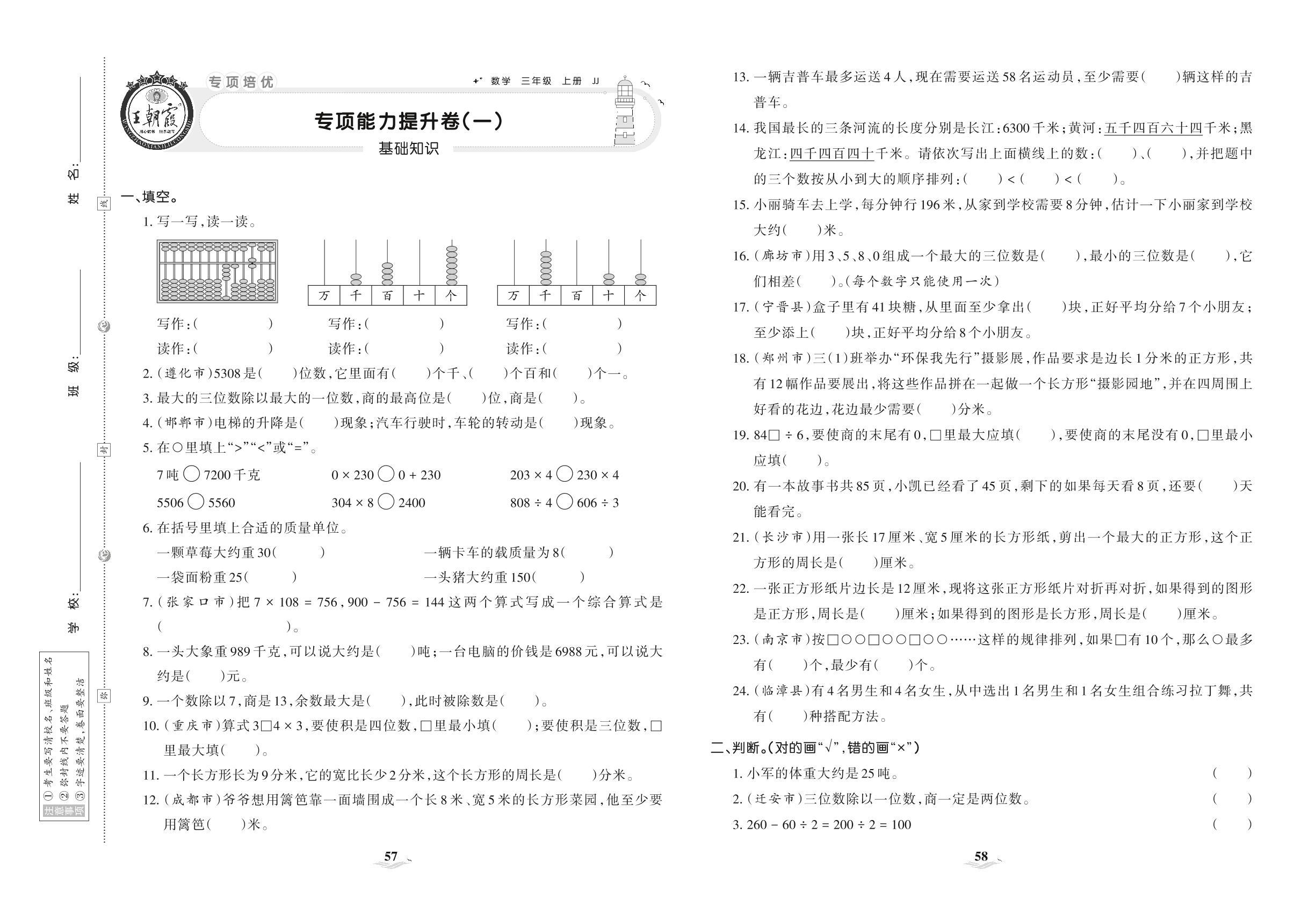 2021上册三年级数学冀教版 专项能力提升卷(一) 基础知识