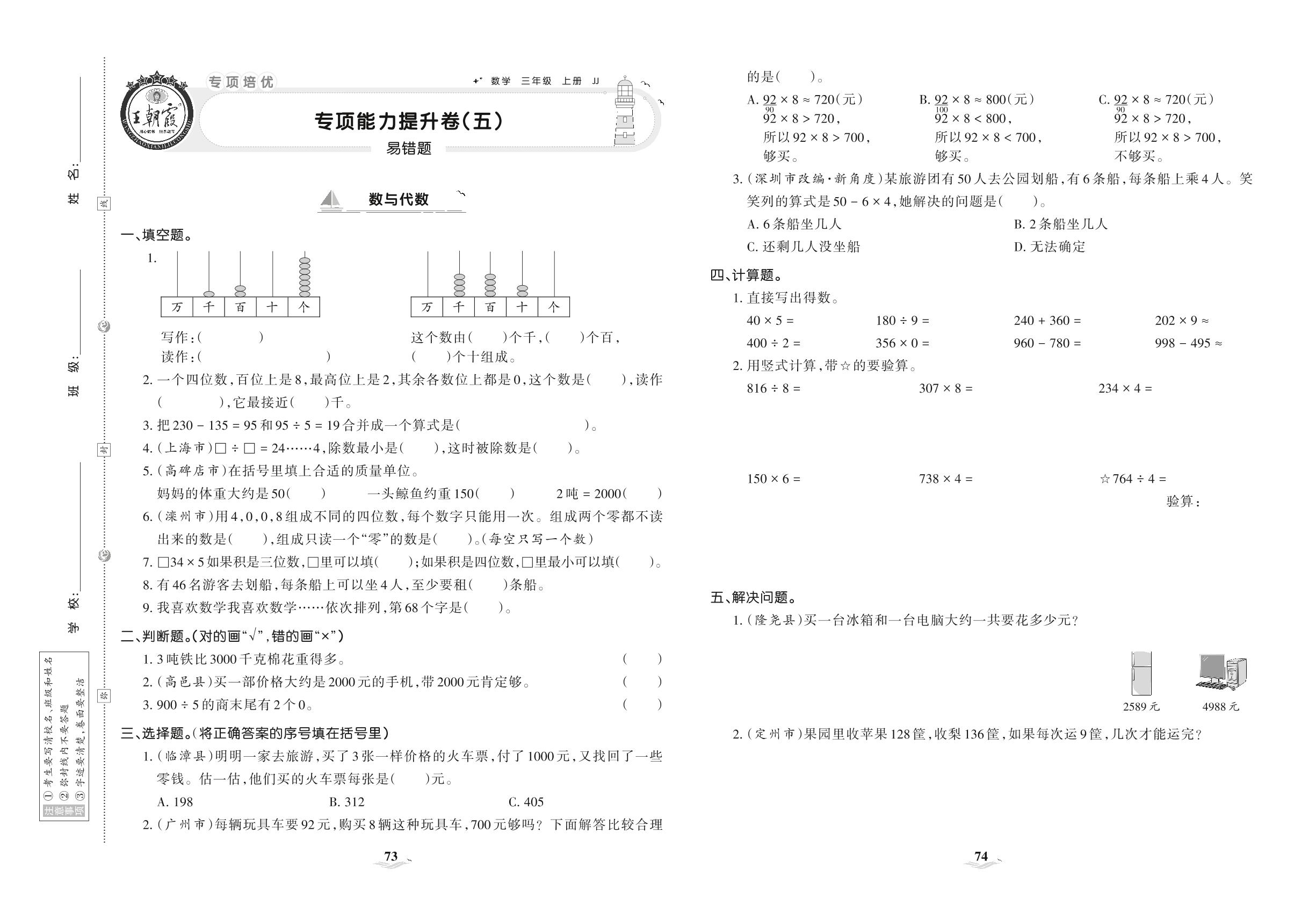 2021上册三年级数学冀教版 专项能力提升卷(五) 易错题