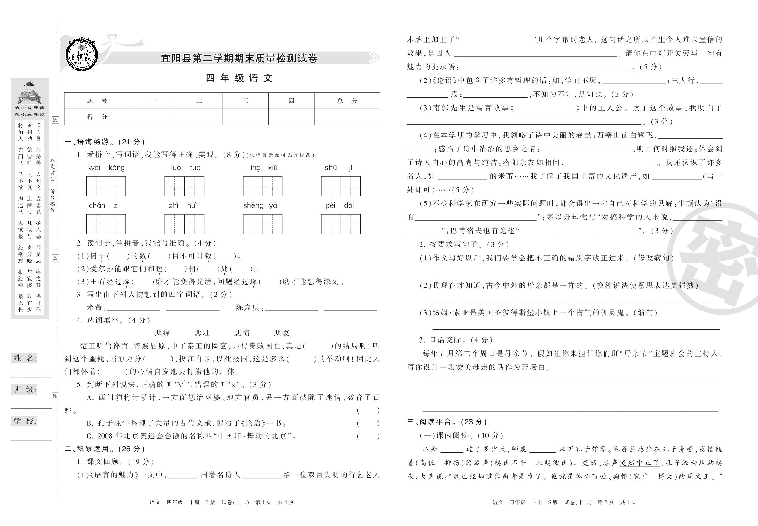 2015-2016学年第二学期洛阳市宜阳县四年级语文试卷(S版)【12】