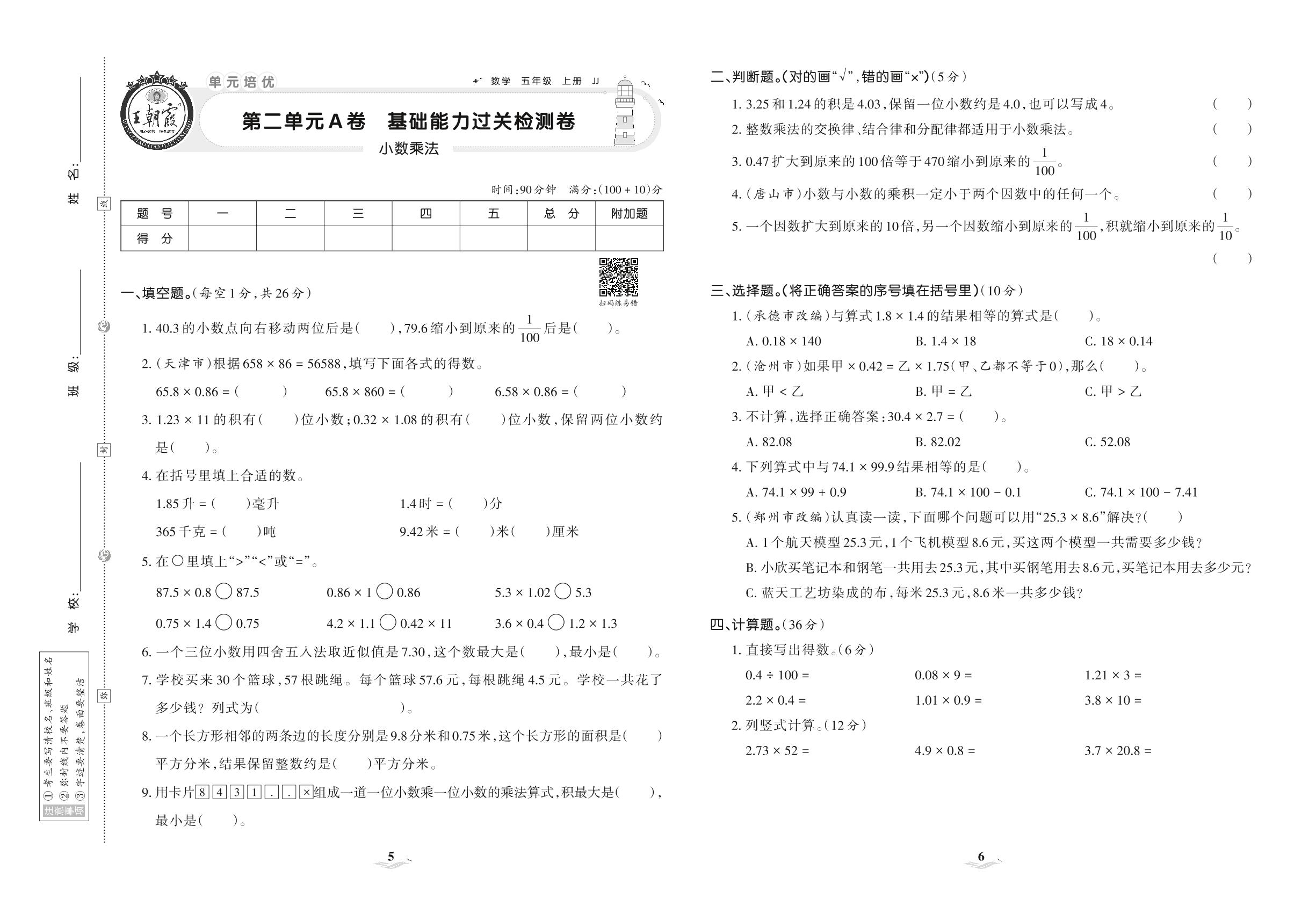 2021上册五年级数学冀教版 第二单元A卷 基础能力过关检测卷