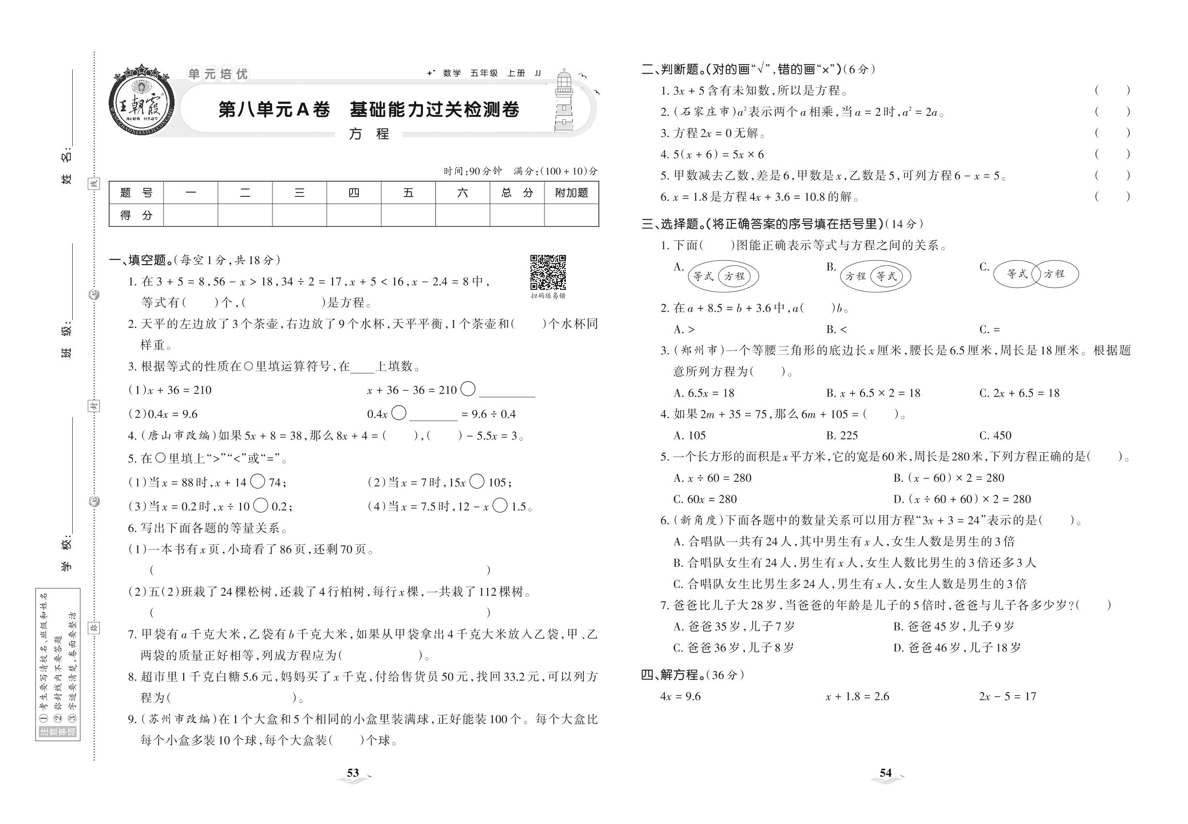 2021上册五年级数学冀教版 第八单元A卷 基础能力过关检测卷