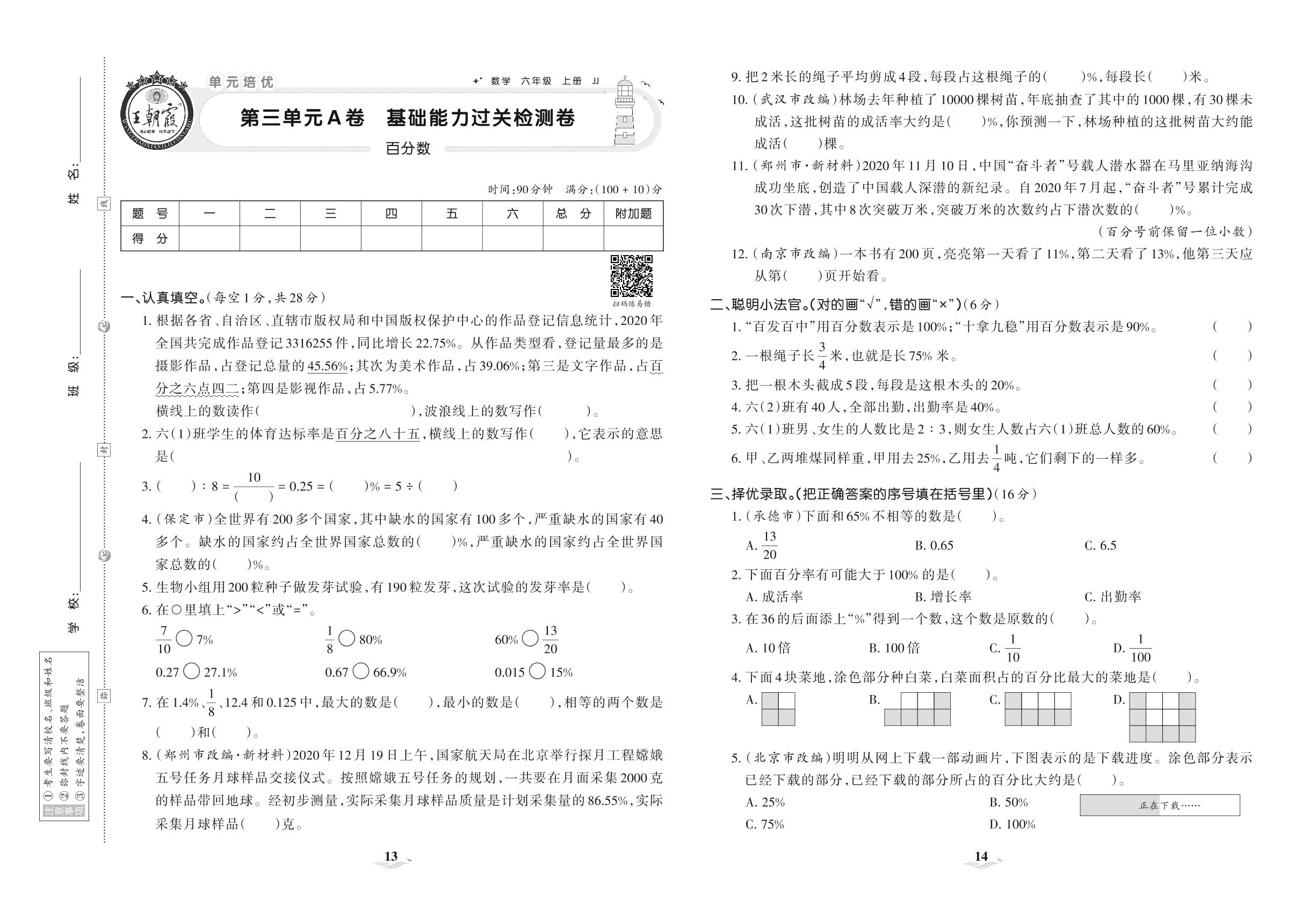 2021上册六年级数学冀教版 第三单元A卷 基础能力过关检测卷